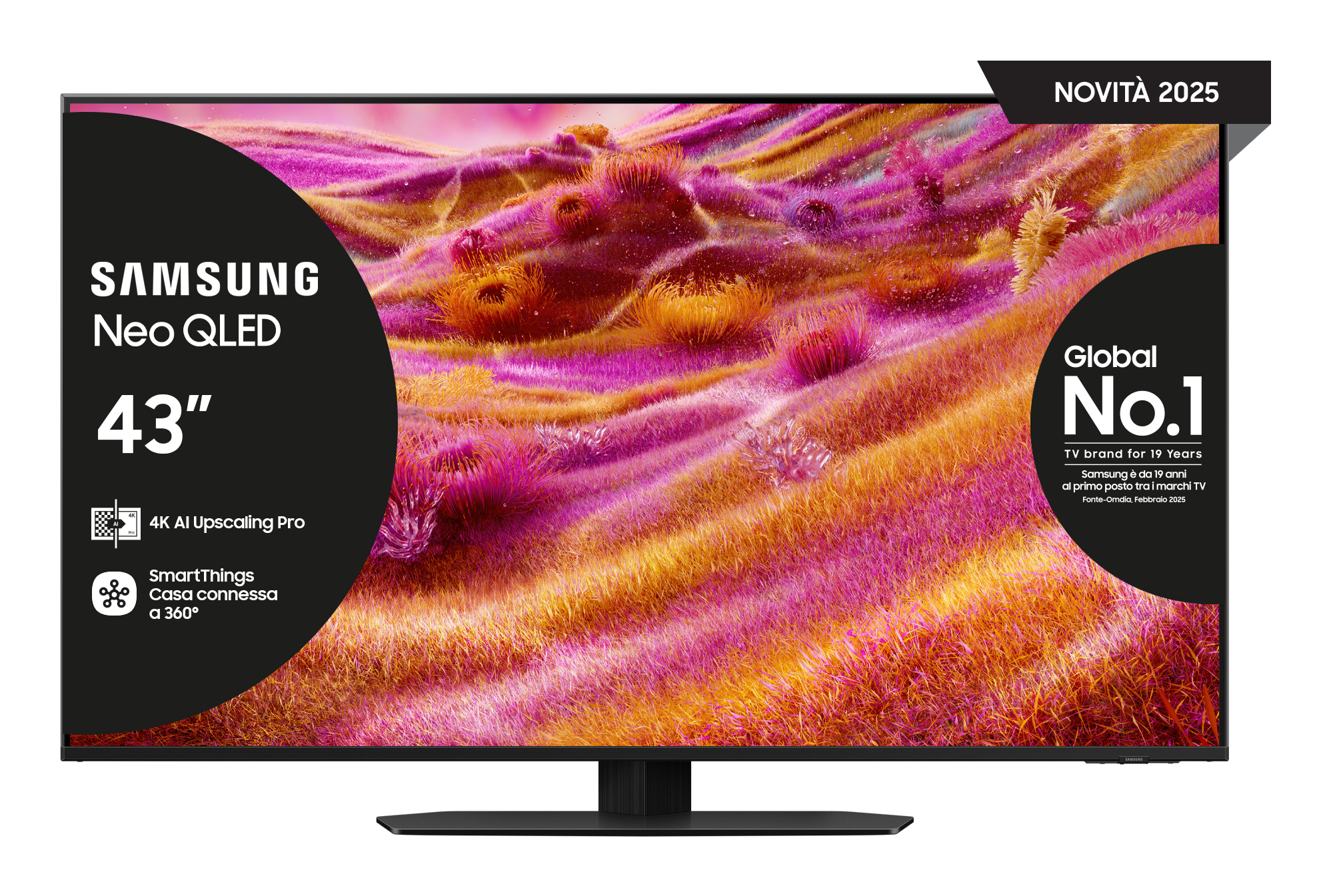 Samsung Smart TV 43” QE43QN90FATXZT Neo QLED 4K Mini LED 2025. Dimensioni diagonale schermo: 109,2 cm (43"), Risoluzione del display: 3840 x 2160 Pixel, Tipologia HD: 4K Ultra HD, Tecnologia display: Neo QLED, Forma dello schermo: Piatto. Smart TV. Tecnologia di interpolazione del movimento: Motion Xcelerator. Formato del segnale digitale: DVB-C, DVB-S2, DVB-T2. Wi-Fi, Collegamento ethernet LAN. Colore del prodotto: Nero