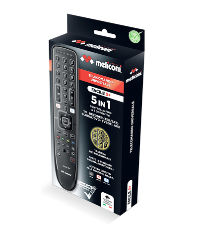 Meliconi Gumbody Facile 5+. Compatibilità marca: Universale, Utilizzo appropriato telecomando: DVD/Blu-ray, Sistema audio domestico, Sistema Home cinema, Sky, Altoparlante Soundbar, TV, Tipo di ingresso: Pulsanti, Pulsanti retroilluminati