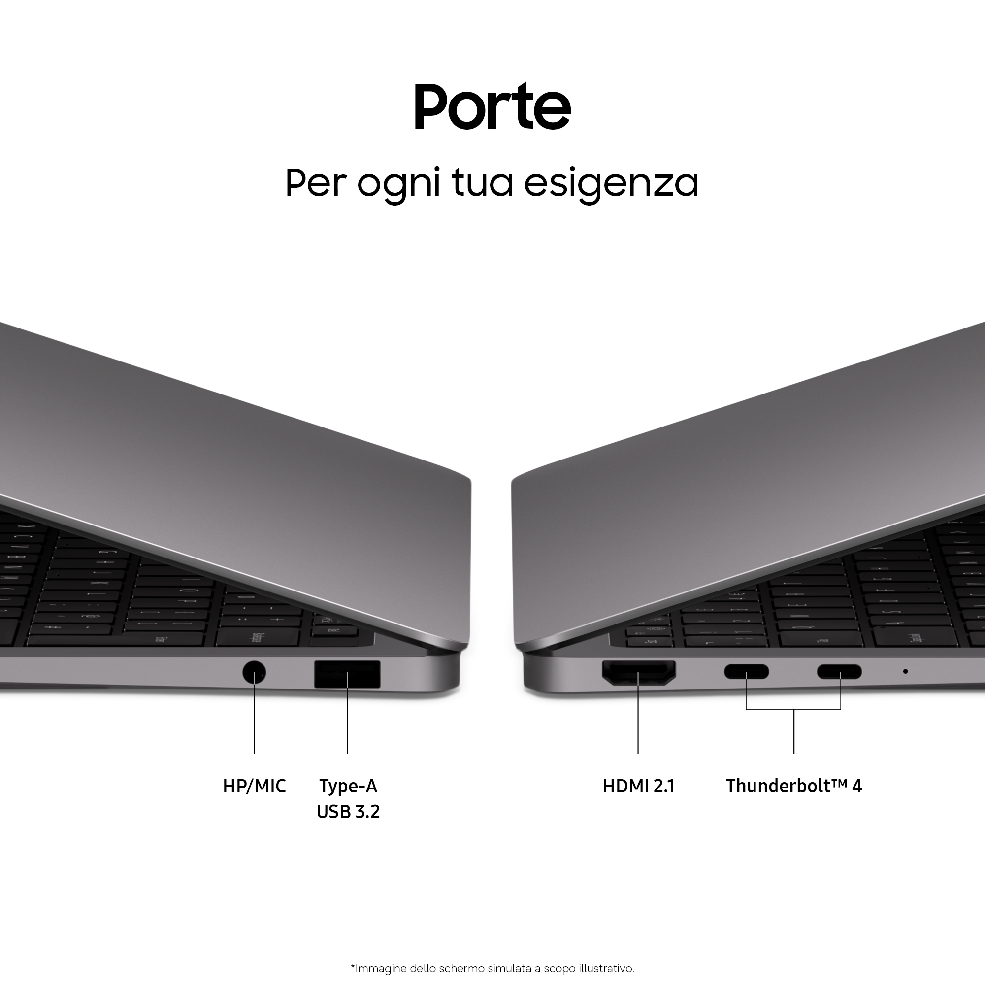 Espandi le tue possibilità ovunque tu lavori. Galaxy Book6 Pro ha una dotazione completa: due porte Thunderbolt 4, USB-A, HDMI e jack per le cuffie, per offrirti la flessibilità necessaria a collegare display, dispositivi di archiviazione e altri dispositivi senza dover utilizzare adattatori extra.