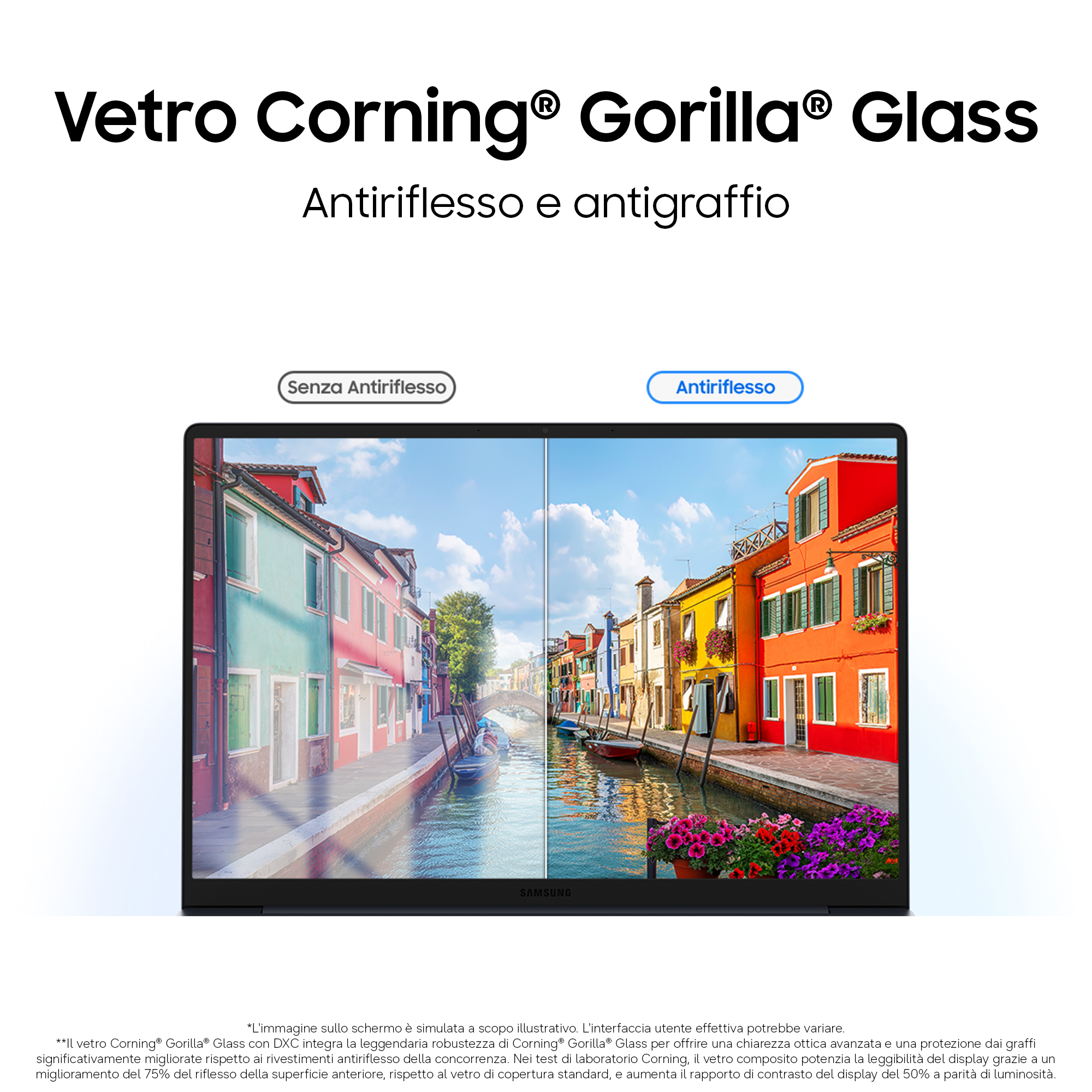 Il vetro Corning® Gorilla® Glass con DXC su Galaxy Book6 Pro riduce fino al 75% i riflessi sulla superficie frontale rispetto ad un vetro standard, per una visione ottimale anche in ambienti molto luminosi. Il vetro composito mantiene la rinomata resistenza ai graffi del Gorilla Glass e offre prestazioni significativamente superiori rispetto ai rivestimenti antiriflesso della concorrenza.
