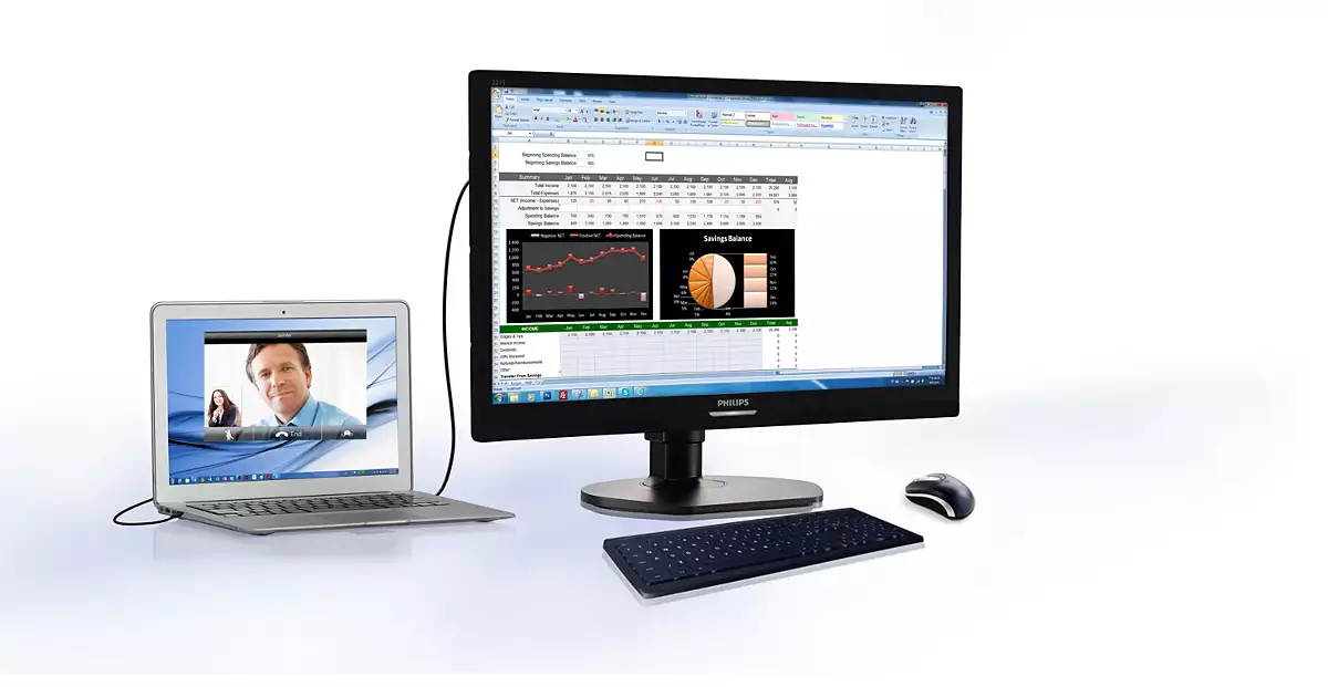 Ora potrai collegare una tastiera completa e il mouse opzionali a questa innovativa hub USB del display Philips per migliorare la tua produttività. Basta collegare il notebook al display tramite un solo cavo USB e potrai utilizzare le periferiche aggiuntive allegate come l'HDD esterno, la fotocamera, l'unità USB con video Full HD, audio, e funzioni Internet. Tuttavia, potrai ovviamente continuare a utilizzare la tua tastiera e il tuo trackpad NBPC.