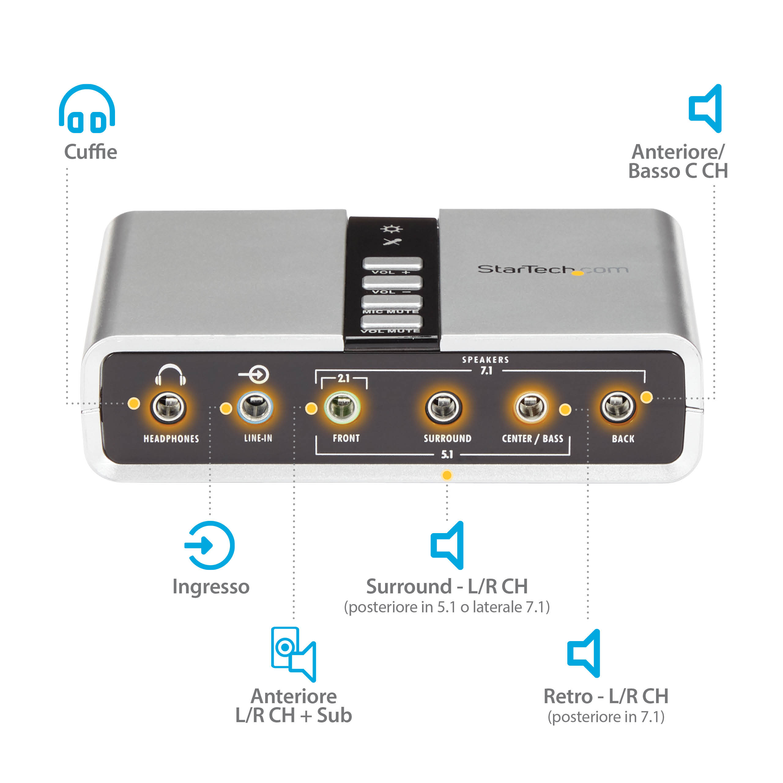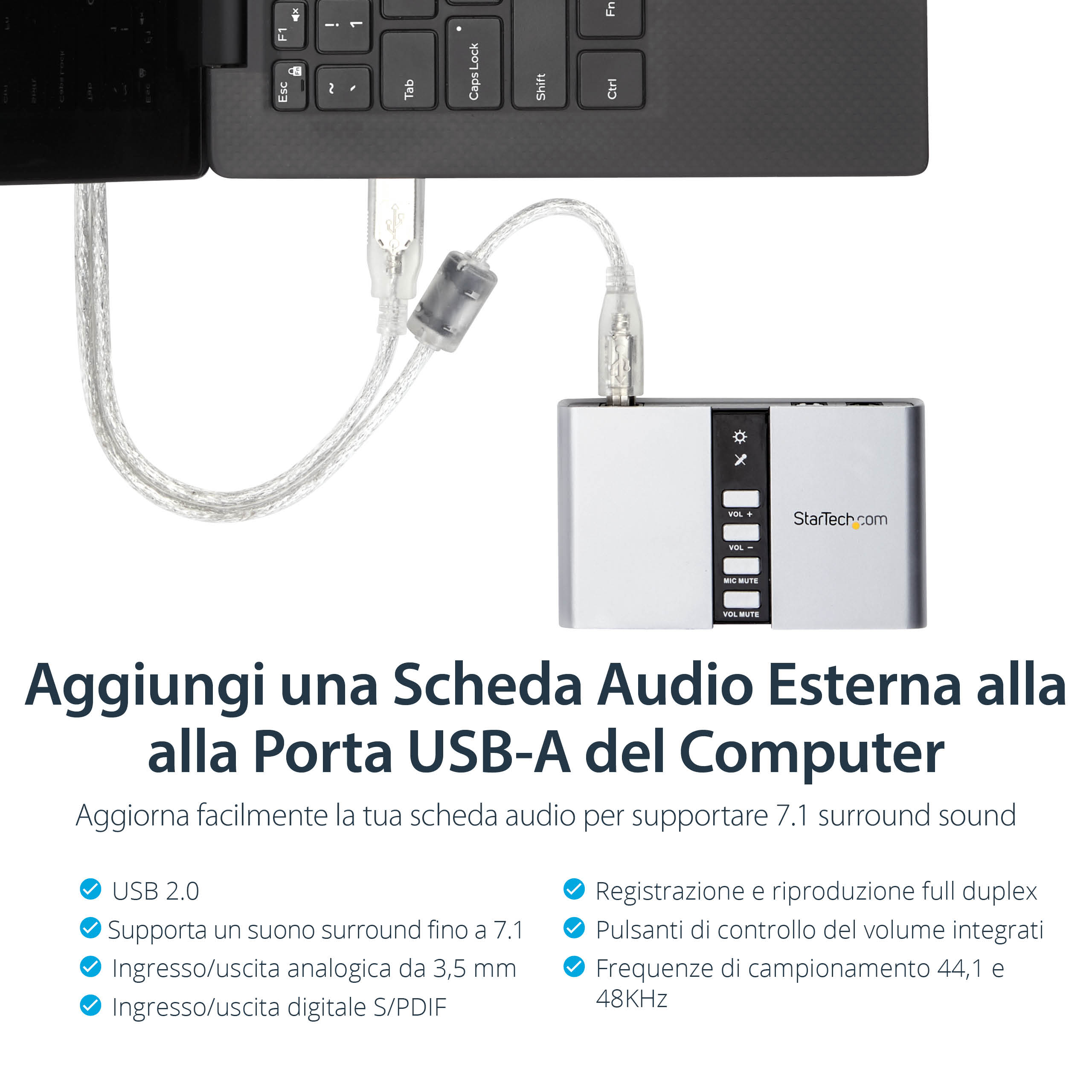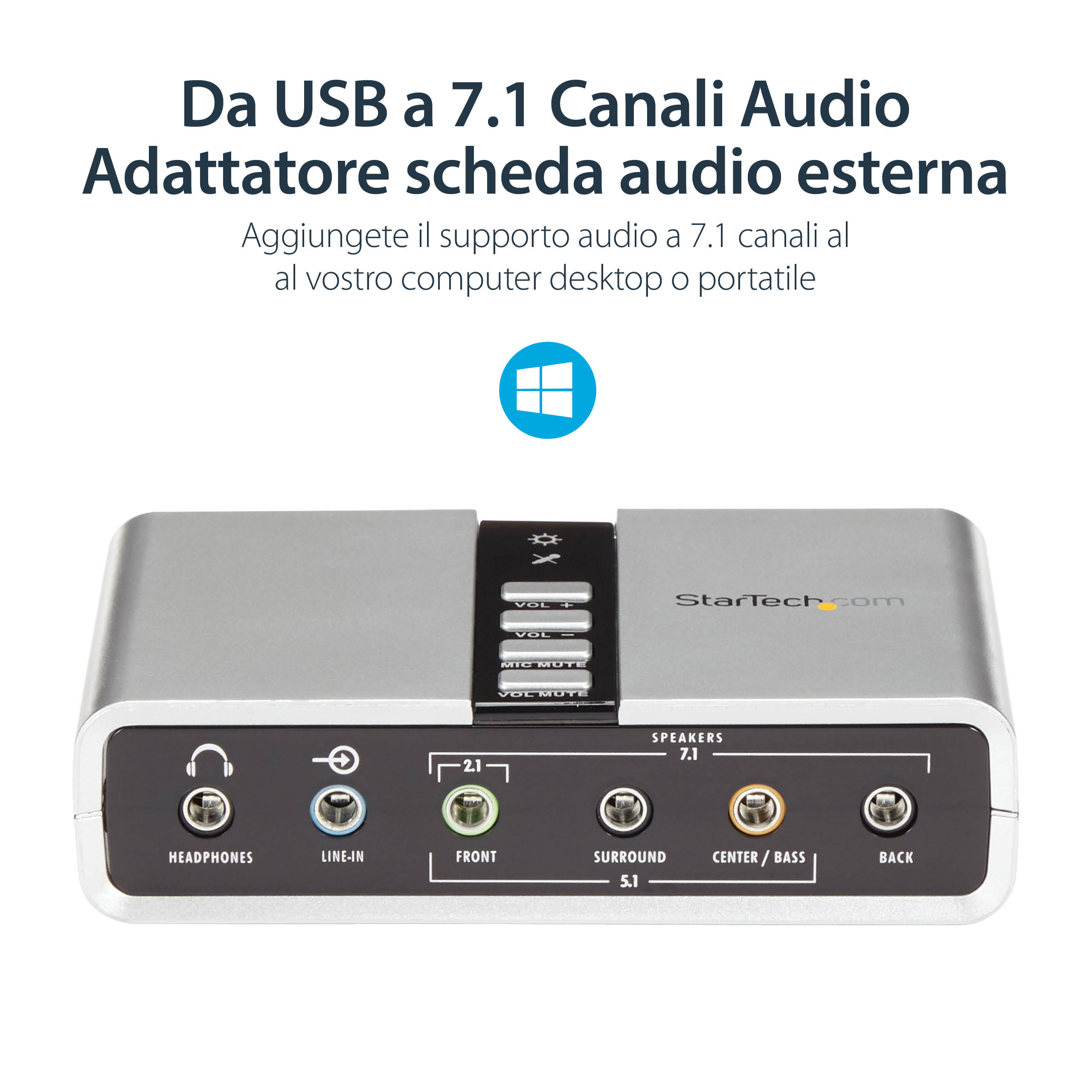 - Supporto totale uscita audio 7.1 in una compatta scheda audio esterna portatile