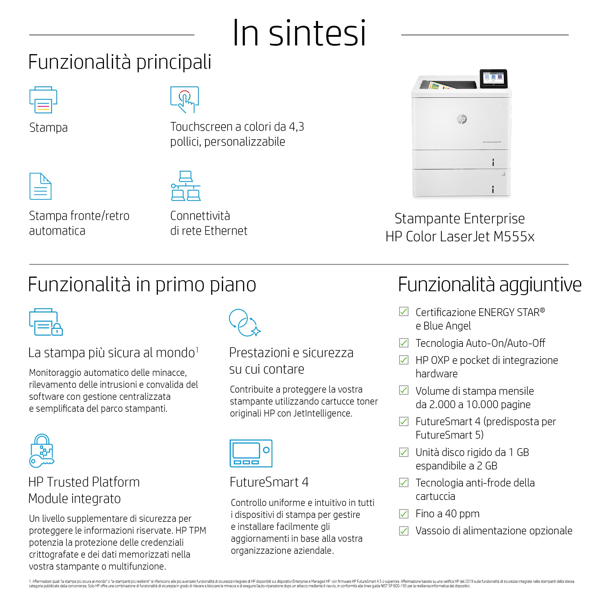HP Color LaserJet Enterprise Stampante Enterprise Color LaserJet M555x, Stampa, Roaming; stampa fronte/retro; efficienza energetica; funzionalità di sicurezza avanzate. Tecnologia di stampa: Laser, A colori. Numero di cartucce di stampa: 4, Ciclo massimo di funzionamento: 8000 pagine per mese. Risoluzione massima: 1200 x 1200 DPI. Massimo formato carta serie ISO A: A4. Velocità di stampa (nero, qualità normale, A4/US Letter): 40 ppm, Stampa fronte/retro. Tipologia display: CGD. Wi-Fi