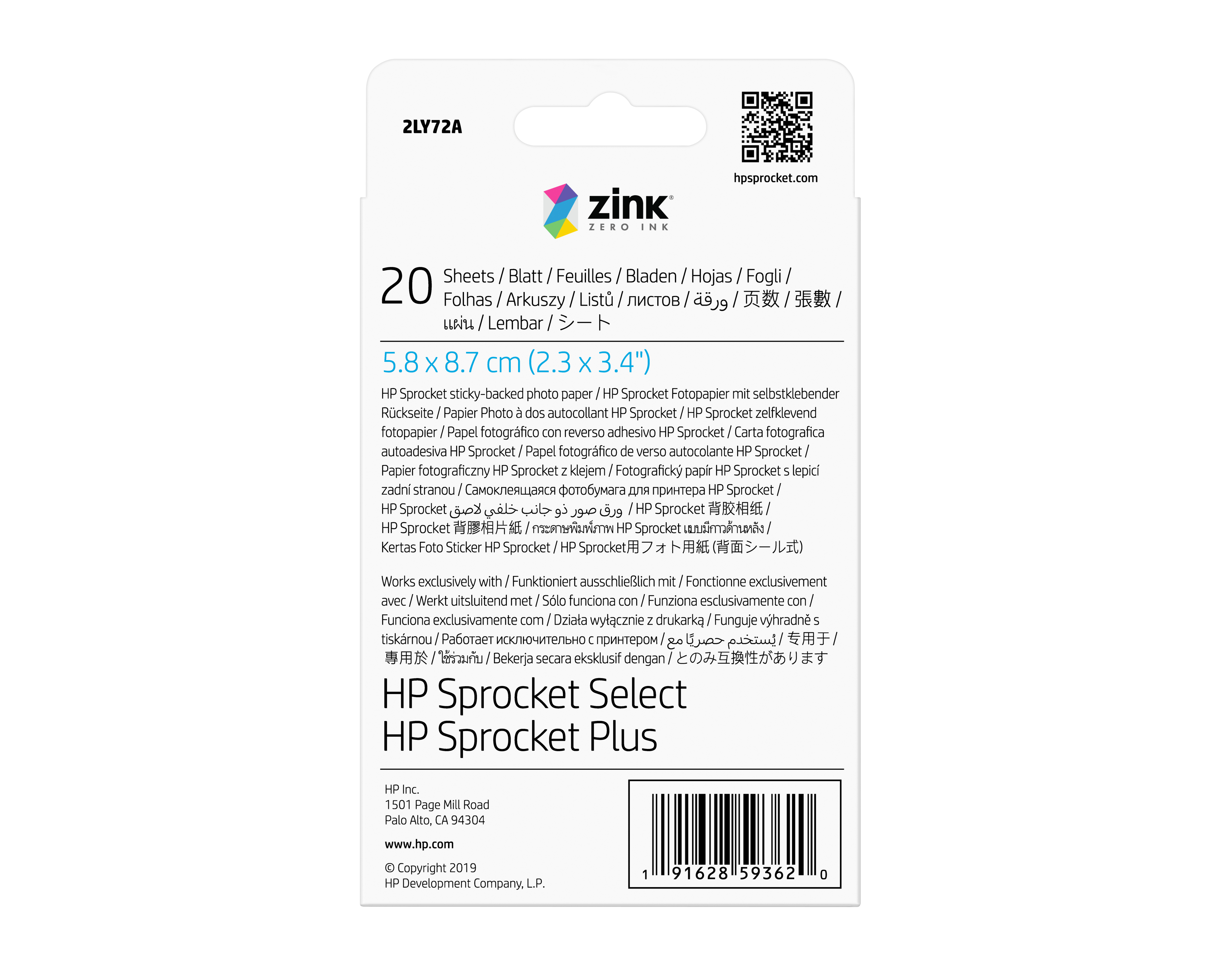 HP Sprocket Plus. Colore del prodotto: Bianco, Tipo rifinitura: Lucida, Peso medio: 258 g/m². Larghezza imballo: 82,6 mm, Profondità imballo: 139,2 mm, Altezza imballo: 17,5 mm. Larghezza: 58 mm, Altezza: 87 mm.Confezione da 20 fogli di carta fotografica Zink, 2LY72A, compatibile con le stampanti portatili HP Sprocket Plus, studiata per chi ama stampare fotografie istantanee in mobilità, dallo smartphone o dalla galleria dei Social Network.Grazie all’applicazione gratuita HP Sprocket, disponibile per dispositivi Android e IOS, puoi personalizzare le foto con cornici, disegni, testi ed Emoji. Rendi i ricordi indimenticabili con la stampante fotografica HP Sprocket Plus e stampa fotografie istantanee dai colori brillanti, nel formato 5.8 x 8.6 cm.La carta Zink è protetta posteriormente da una pellicola removibile, che se rimossa, trasforma le foto in adesivi divertenti dai colori veri, profondi e che non temono l’ingiallimento. Resistenti a sbavature, a strappi e all’acqua.La tecnologia alla base della carta fotografica per HP Sprocket è la carta Zink, "Zero Ink" che, come dice il nome, non necessita di cartucce di inchiostro per stampare. Esatto, avete capito bene. Non c’è bisogno di cartucce, perché ogni singolo foglio di carta Zink è formato da diversi strati nei quali è contenuto l’inchiostro necessario per realizzare le stampe fotografiche.