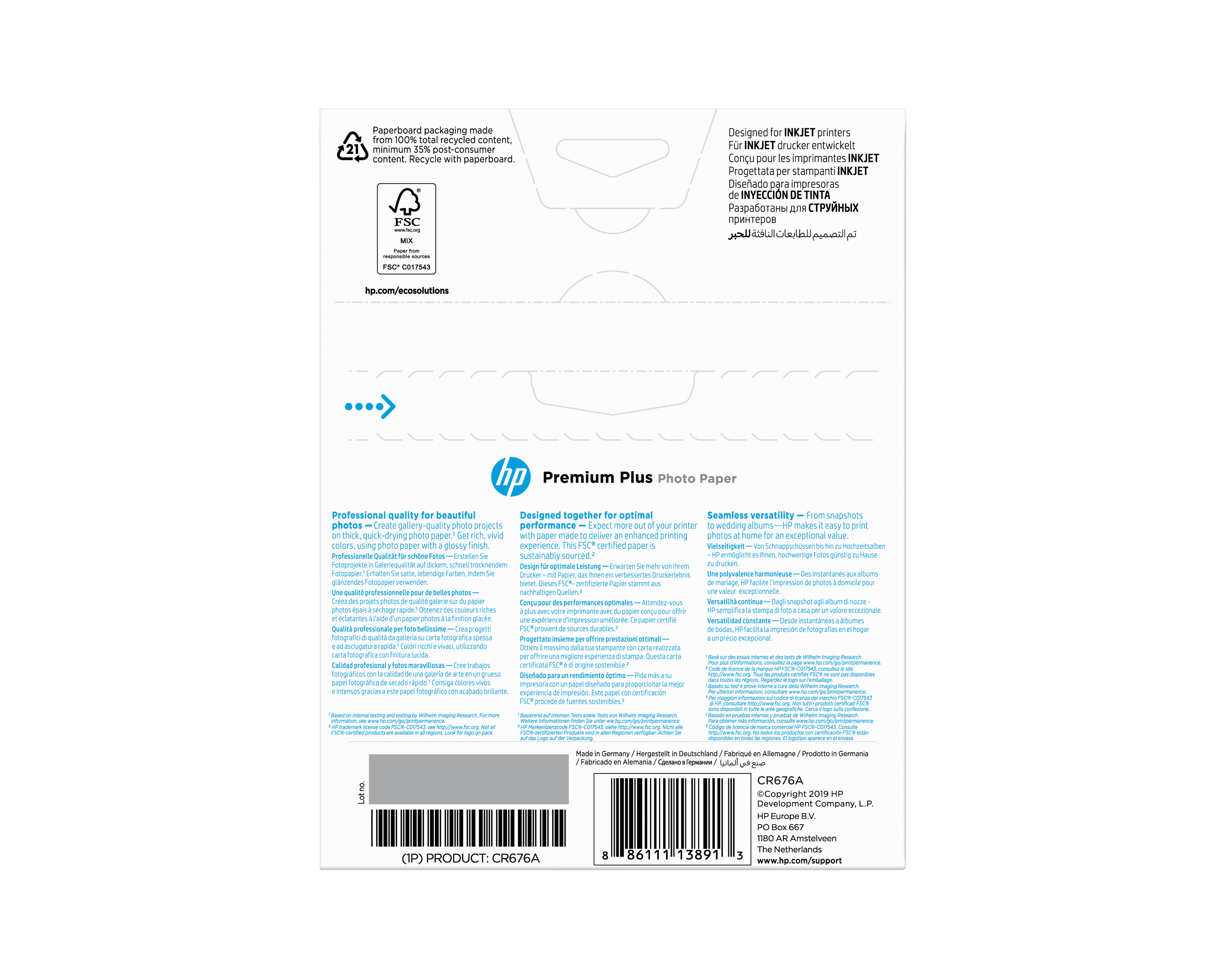 HP Confezione da 20 fogli carta fotografica Premium Plus, lucida 13 x 18 cm. Tipo rifinitura: Lucida, Fogli per pacco: 20 fogli, Peso medio: 300 g/m². Larghezza: 149,2 mm, Profondità: 14,3 mm, Altezza: 193,7 mm. Numero di scatole per strato: 26 pz, Peso del pallet: 90 kg, Numero di cartoni per pallet: 26 pz. Quantità per pallett: 260 pz, Dimensioni (LxPxA): 149 x 14 x 194 mm, Dimensioni imballo (LxPxA): 149 x 14 x 194 mm. Dimensioni pallet (L x P x A): 1133 x 786 x 314 mm, Quantità master carton: 10 pz, Peso incluso imballo: 2,5 kg