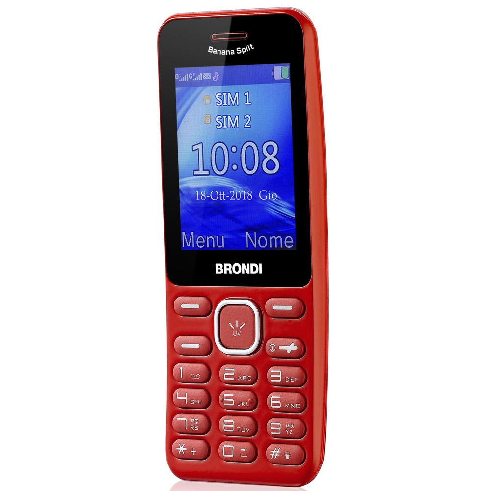 Brondi Banana Split. Fattore di forma: Barra. Capacità della scheda SIM: Doppia SIM. Dimensioni diagonale schermo: 6,1 cm (2.4"), Risoluzione del display: 240 x 320 Pixel. Risoluzione fotocamera posteriore (numerico): 1,3 MP. Bluetooth. Radio FM. Tecnologia batteria: Ioni di Litio, Capacità della batteria: 800 mAh, Autonomia in standby (2G): 240 h. Peso: 74 g. Colore del prodotto: Rosso