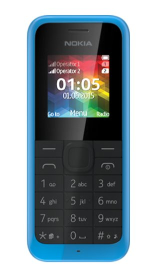 Nokia 105. Fattore di forma: Barra. Capacità della scheda SIM: Doppia SIM. Dimensioni diagonale schermo: 3,68 cm (1.45"), Risoluzione del display: 128 x 128 Pixel. Radio FM. Capacità della batteria: 800 mAh, Autonomia in standby (2G): 840 h. Peso: 69,6 g. Colore del prodotto: Blu