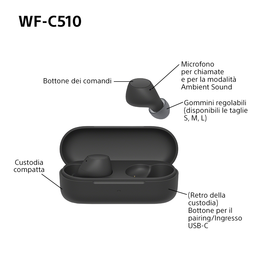Sony WF-C510 | Cuffie True Wireless - Suono di alta qualità, Equalizzatore personalizzabile, Design Confortevole, Batteria da 22 ore, Ricarica Rapida, Connessione Multipoint Bluetooth, Ambient Sound Mode, Spotify Tap, Classificazione IPX4 - Nero. Tipo di prodotto: Auricolare. Tecnologia di connessione: True Wireless Stereo (TWS), Bluetooth. Utilizzo raccomandato: Chiamate/Musica/Sport/Tutti i giorni. Range wireless: 10 m. Peso: 31 g. Colore del prodotto: Nero