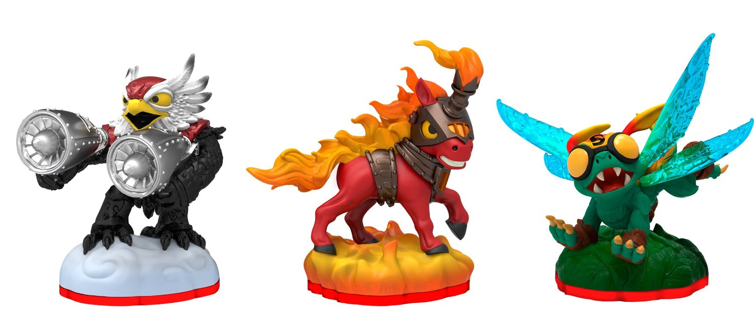 Trail Blazer Trail Blazer aveva sempre avuto un carattere focoso e irruento, soprattutto di fronte alle ingiustizie. Un giorno si imbatté in un altro unicorno che era rimasto intrappolato in una rete e si affrettò a liberarlo. Era il mitico Unocorn, una creatura magica che spargeva cannella incantata su tutte le Skylands con il suo Corno di Ciambella! Quando gli Stregoni del Buio che avevano piazzato la trappola scoprirono che il loro piano era fallito, si arrabbiarono moltissimo. Ma Trail Blazer era ancora più arrabbiato di loro, perché la cannella del Corno di Ciambelle gli era finita addosso, combinandosi con il suo fuoco elementale in una miscela esplosiva. La sua furia era tale che prese letteralmente fuoco e, lasciandosi dietro una scia di fiamme, si mise a correre intorno agli stregoni fino a metterli in fuga. Resosi conto che la sua furia poteva essere usata per combattere contro il male, Trail Blazer si recò dagli Skylanders, che lo accolsero a braccia aperte. High Five High Five era il corridore dei cieli più abile che si fosse mai visto. Quinto figlio delle Libellule Reali Volanti, a causa della sua giovane età non poteva partecipare alle competizioni che si svolgevano ogni anno, ed era costretto a restarsene in disparte a guardare i suoi quattro fratelli contendersi l'ambito Trofeo di Sparx, che si dice abbia proprietà magiche. Un anno, durante l'evento più importante della stagione, venne a sapere che il Racing Team dei Troll aveva rubato il prezioso trofeo e avrebbe usato la gara per coprire la sua fuga. High Five entrò rapidamente in azione, usando le sue incredibili abilità di volo per schivare e sorpassare gli altri concorrenti fino a raggiungere i troll in testa alla gara e costringerli ad atterrare. Per il suo coraggio fu premiato con il Trofeo di Sparx e, cosa ancora più importante, con la nomina a Skylander. Ora contribuisce a proteggere le Skylands da tutti i furfanti! Jet-Vac Jet-Vac era l'asso dei cieli più abile e temerario di tutta Windham. Come tutti i Baroni dei Cieli, aveva ricevuto le sue ali magiche da giovane, ma quando la sua terra venne invasa da bande di razziatori, le cedette a una giovane madre per consentirle di portare in salvo i figli. Il nobile gesto non sfuggì a Padron Eon, che si recò dal giovane Barone dei Cieli e gli offrì un regalo: un potente dispositivo che gli avrebbe consentito di tornare a svettare nei cieli. Jet-Vac accettò il dono con gratitudine, e da allora ora combatte coraggiosamente il male al fianco degli altri Skylander.