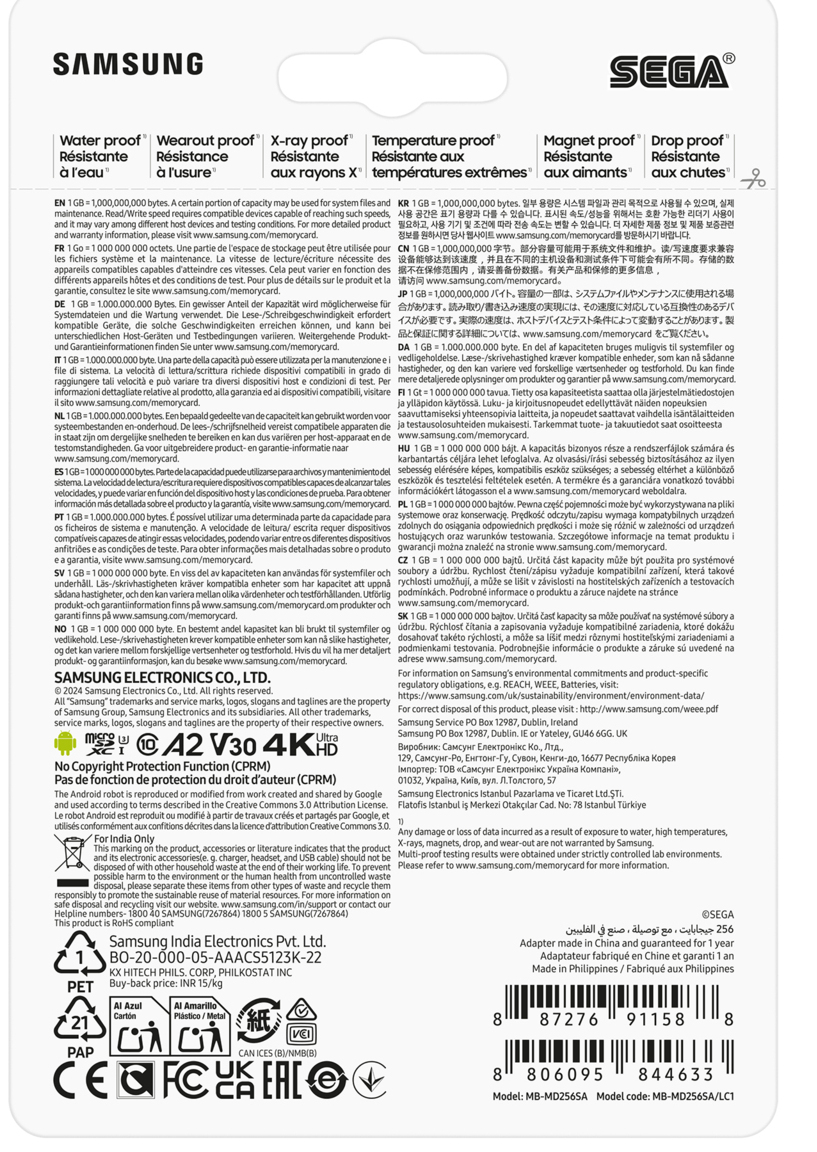 Samsung MB-MD256S. Capacità: 256 GB, Tipo flash card: MicroSDXC, Classe di memoria flash: Classe 10, Tipo di RAM: UHS-I, Velocità di lettura: 180 MB/s, Velocità di scrittura: 130 MB/s, Classe di velocità UHS: Class 3 (U3), Classe di velocità video: V30. Funzioni di protezione: Resistente alle cadute, A prova di magnete, A prova di temperatura, Impermeabile, A prova di raggi X, Colore del prodotto: Grigio, Bianco, Giallo