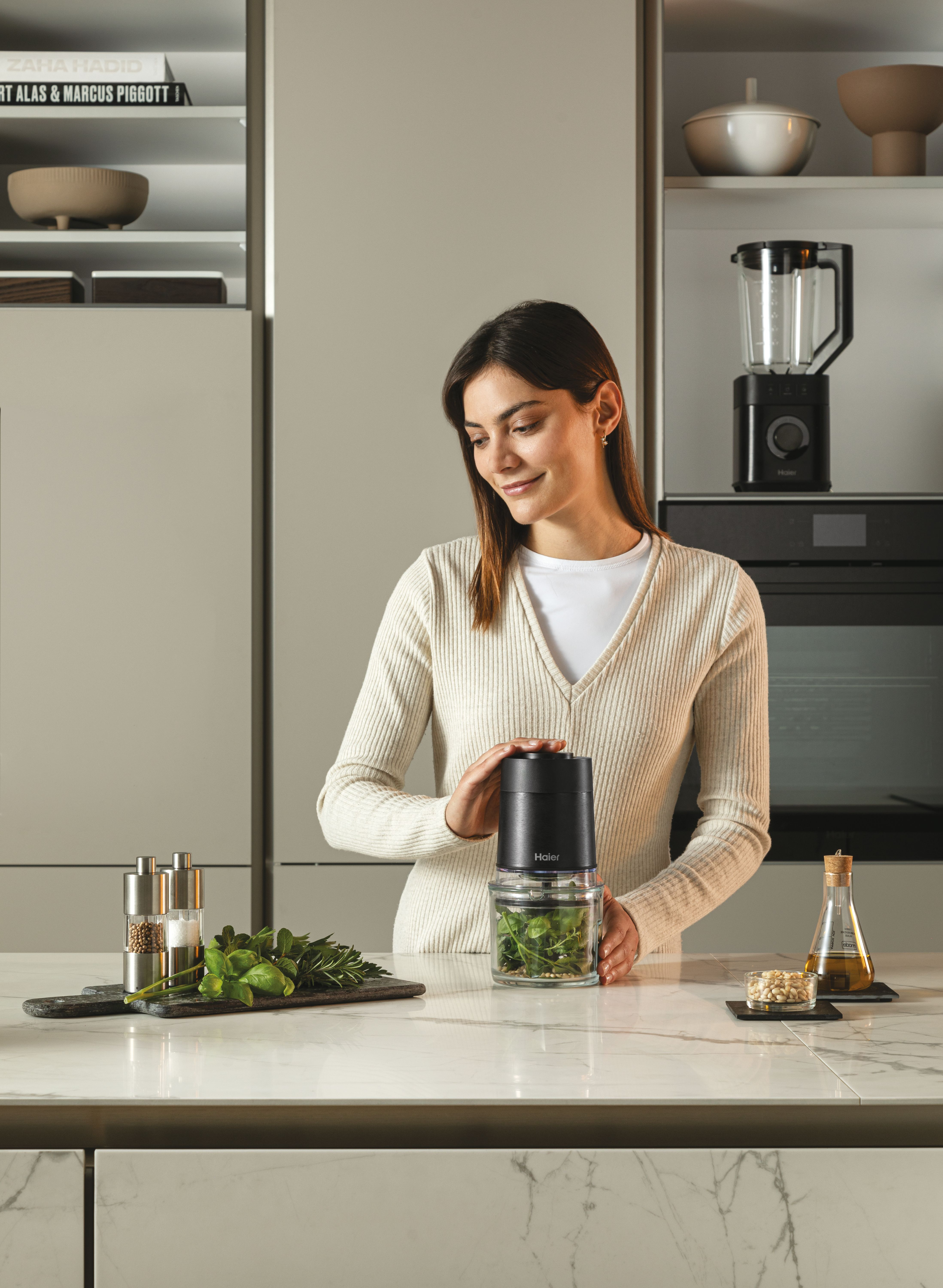 Haier Tritatutto I-Master Serie 5 Nero, 4 lame in acciaio inox, 2 livelli di velocità, Ciotola in vetro 0,5 L. Capacità ciotola: 0,5 L, Velocità (minima) di rotazione: 3800 Giri/min, Velocità (massima) di rotazione: 7300 Giri/min. Colore del prodotto: Nero, Materiale ciotola: Vetro, Materiale lama: Acciaio inox. Potenza: 550 W, Tensione di ingresso AC: 220-240 V, Frequenza di ingresso AC: 50-60 Hz. Larghezza: 124 mm, Profondità: 124 mm, Altezza: 243 mm. Larghezza imballo: 140 mm, Profondità imballo: 140 mm, Altezza imballo: 310 mm