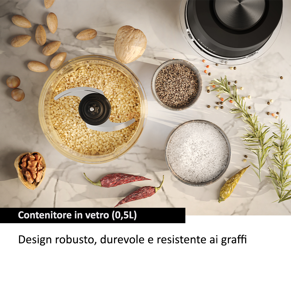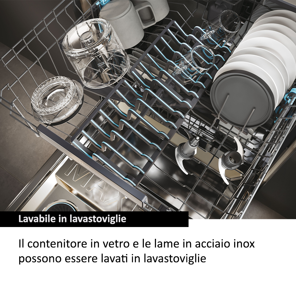 Caraffa in vetro robusta e durevole che previene graffi, alterazioni del sapore degli alimenti e garantisce una pulizia senza pensieri. Tutte le parti del Tritatutto I-Master Serie 5 sono lavabili in lavastoviglie.