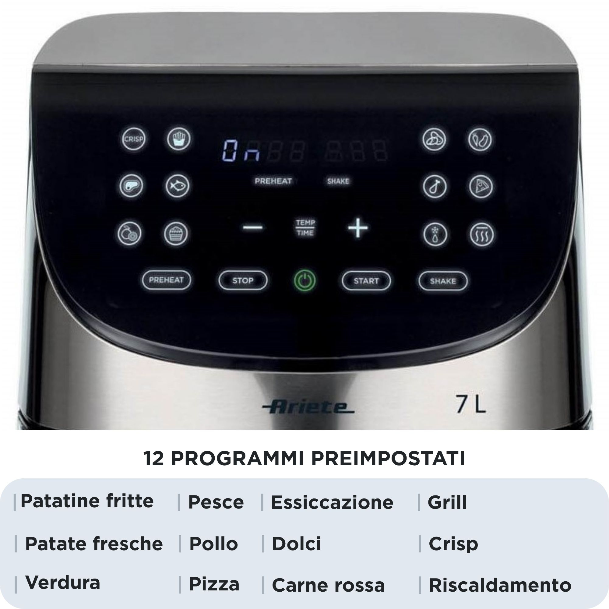 Con Friggitrice ad Aria 7L puoi friggere qualsiasi pietanza in grandi quantità, utilizzando un solo cucchiaio di olio per ottenere fritture sane e gustose allo stesso tempo. Grazie al grande cestello da 7 L, con Friggitrice ad Aria 7L di Ariete potrai cuocere fino a 2,8 kg di patatine fritte in una sola volta! Patatine fritte, ma non solo, anche crocchette, pesce, carne e tanti altri alimenti impanati, sia surgelati e pronti da friggere, che freschi e appena impanati, grazie a 12 programmi preimpostati.Come funziona la friggitrice ad aria?La friggitrice ad aria cuoce grazie all’aria ad alta temperatura, regolabile da 35°C fino a 200°C, che circola alla massima velocità e a 360° all’interno della camera di cottura e garantisce una distribuzione uniforme del calore al suo interno. E’ proprio l’aria calda che consente una cottura omogenea delle pietanze e la formazione di una croccante crosticina all’esterno, che non ha niente da invidiare alla frittura tradizionale. Grazie all’aria calda, non ci sarà bisogno di aggiungere tanto olio per ottenere un fritto gustoso, perché ne basterà un semplice cucchiaio, in questo modo porterai in tavola cibi più leggeri, ma gustosi per tutta la famiglia. Dal grande pannello touch screen puoi regolare tempi di cottura, programmi, temperatura e timer. Friggitrice ad Aria 7L dispone della funzione Max Crisp: grazie all’apposita griglia che posiziona i cibi rialzati all’interno della camera d’aria, la cottura dei cibi risulterà più croccante in pochi minuti. Friggitrice ad aria 7L presenta 2 plus: la funzione riscaldamento e il segnale shake. Quest’ultimo indica quando è necessario girare le pietanze all’interno del cestello in modo da ottimizzare la cottura. La frittura è proprio nelle tue mani!Friggitrice ad Aria 7L è facile da pulire grazie al cestello antiaderente con griglia e ha un basso impatto ambientale, perché non produce olio esausto, che rappresenta uno dei rifiuti che si smaltiscono più difficilmente in circolazione. Il rivestimento interno delle Friggitrici ad aria Ariete è BPA Free per tutte le parti destinate al contatto con gli alimenti (Basato su test di terze parti).