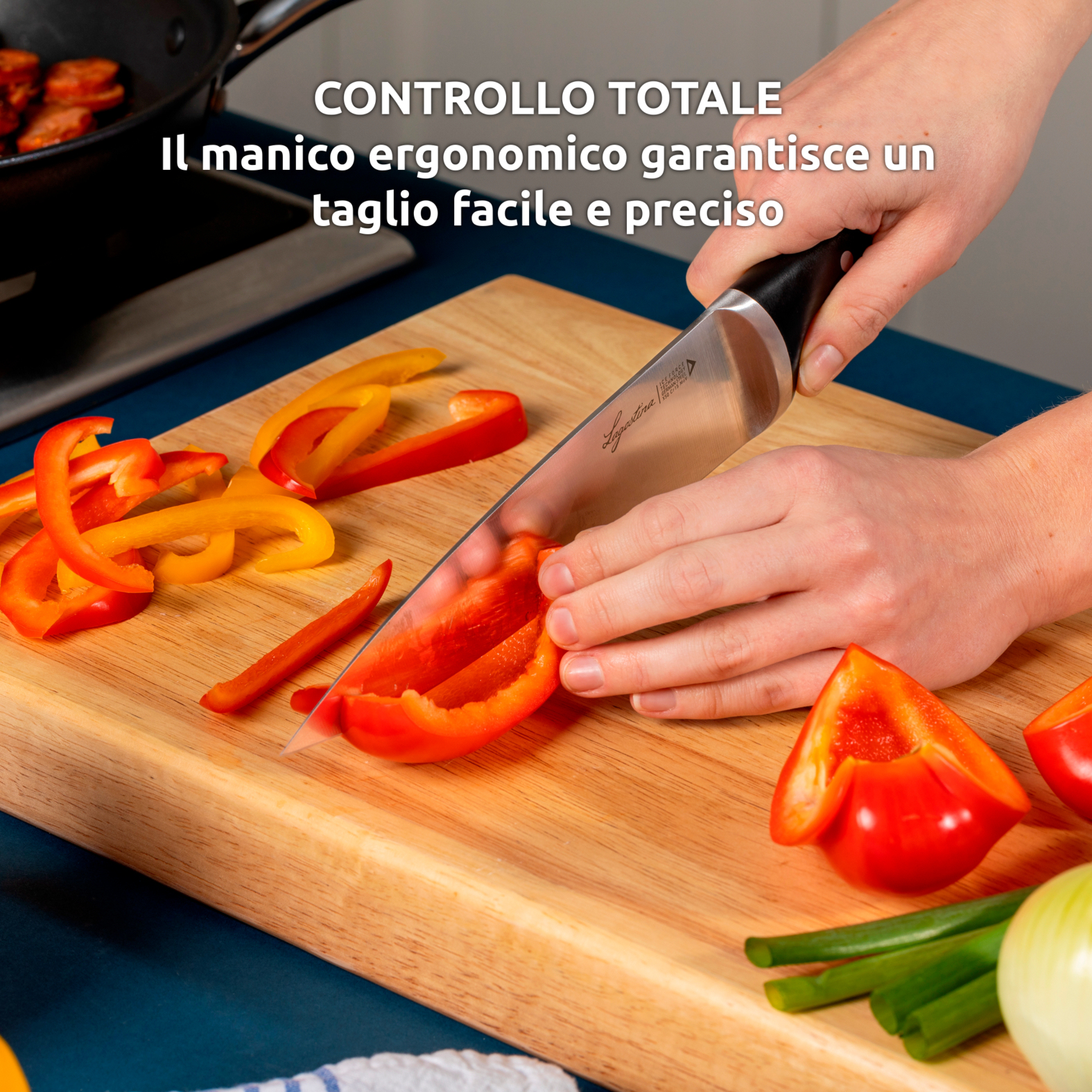 Scegli i coltelli da cucina Lagostina Ice Force per un'esperienza di taglio ottimale. Una gamma di prodotti must-have per tutte le tue esigenze in cucina. Questi coltelli coniugano prestazioni durature nel tempo con un design moderno, grazie alla tecnologia Ice Force, che prevede un processo criogenico di raffreddamento delle lame a -120 °C, per assicurare lame sempre affilate e prestazioni ottimali. Realizzato in acciaio inox tedesco, il coltello spelucchino è perfetto per pelare e tagliare in pezzettini. Scegli i coltelli da cucina Lagostina Ice Force per un'esperienza di taglio ottimale.*Rispetto alle altre gamme Lagostina in acciaio inox (Heritage).