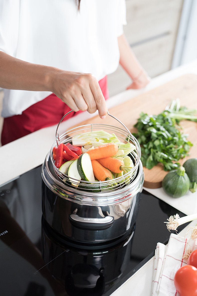 Lagostina Mia Lagoeasy'up Pentola a pressione Ø cm 22 - L 7. Capacità totale: 7 L, Adatto per tipi di piano cottura: Ceramica, Gas, Alogena, Induzione, Piastra sigillata, Colore del prodotto: Acciaio inox. Peso: 2,13 kg. Quantità per pacco: 1 pz. Peso dell'imballo: 2,7 kg, Profondità imballo: 340 mm, Larghezza imballo: 230 mm