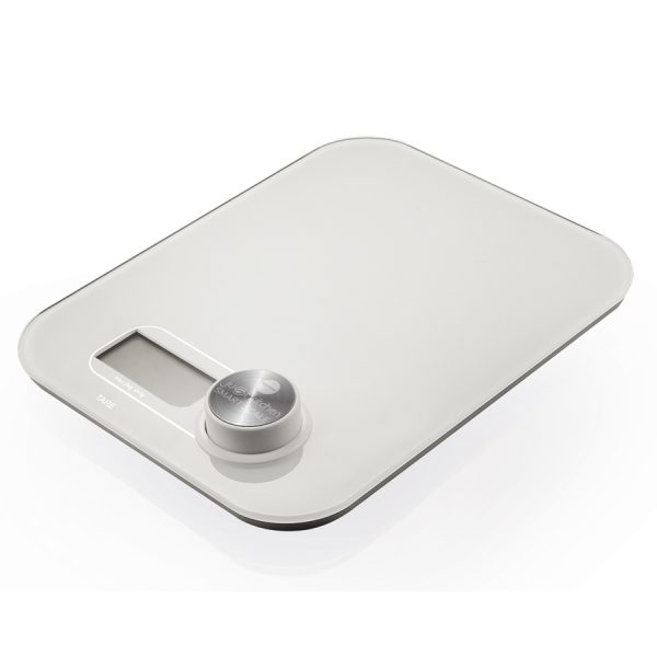 Elegante bilancia per alimenti. L’innovativo funzionamento SENZA PILE, garantisce un utilizzo di più di 50.000 pesate. Ricaricabile manualmente.