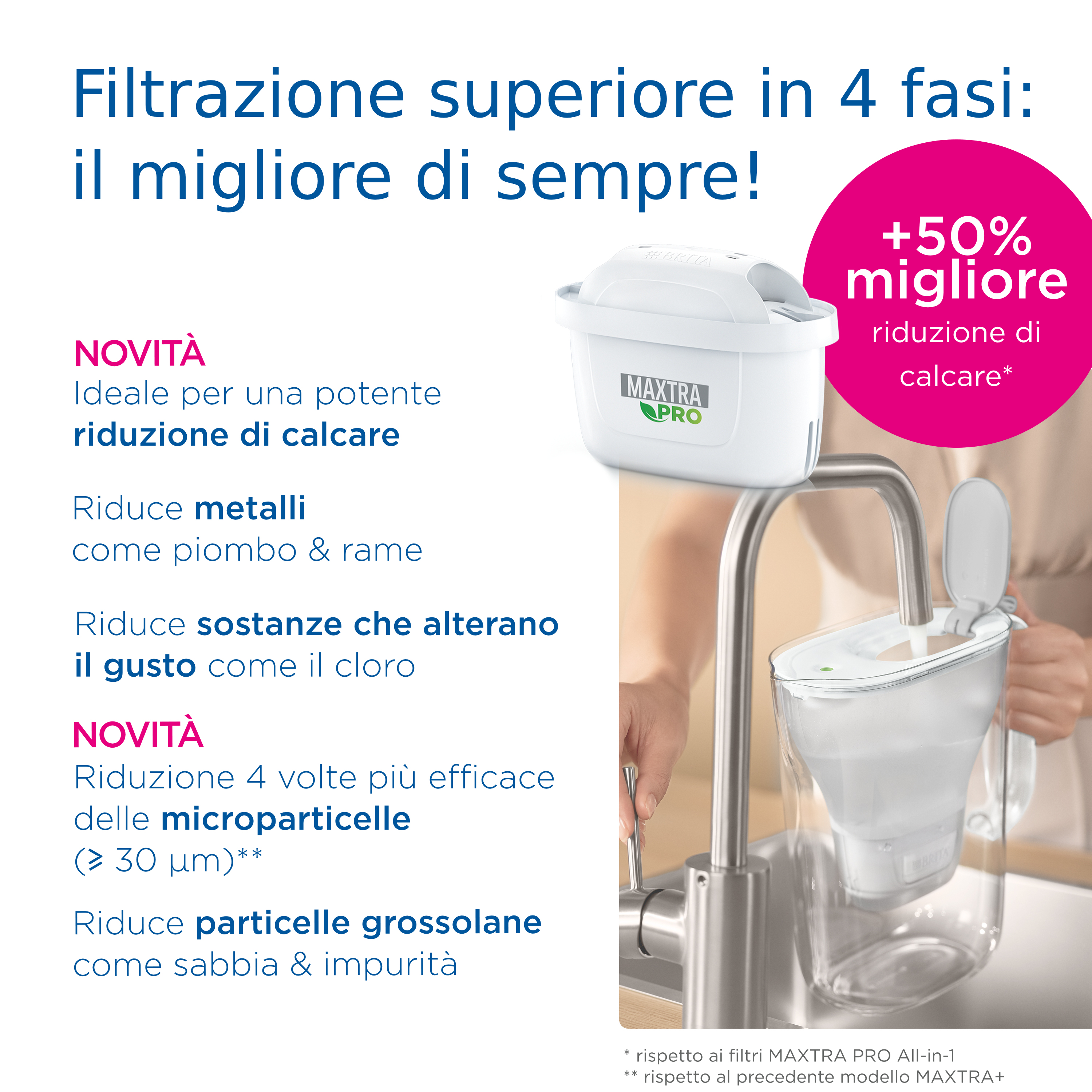 - Prestazioni del filtro migliorate: l'innovativa micro-mesh riduce le microparticelle (≥ 30 μm) fino 4 volte meglio rispetto al precedente filtro BRITA MAXTRA+ - ideale per le tubazioni più vecchie