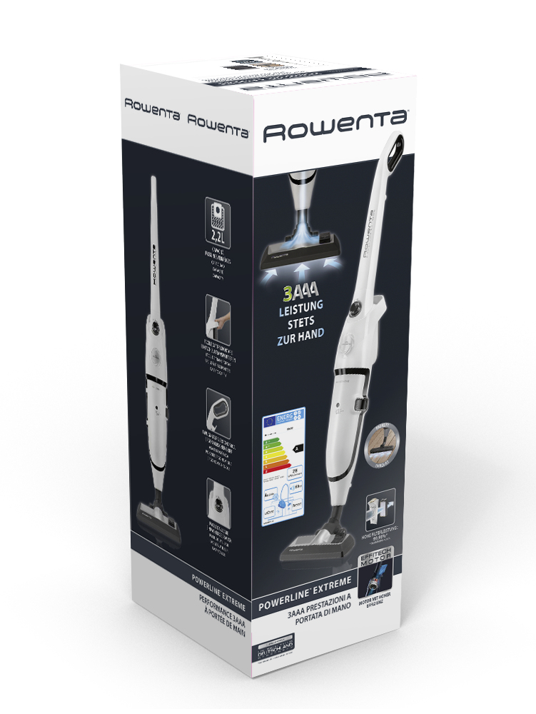 Rowenta Powerline Extreme Bagged RH8037WA Scopa Elettrica con Filo e Sacco, Potenza 750 W, Bianco. Tipo di prodotto: Aspirapolvere a bastone, Tipo di contenitore della polvere: Sacchetto per la polvere, Colore del prodotto: Bianco. Tipo di pulizia: Secco, Metodo di separazione dello sporco: Filtro, Superficie di pulizia: Tappeto, Superfici rigide. Lunghezza cavo: 6 m. Alimentazione: AC, Massima potenza in entrata: 750 W, Consumo energetico annuo: 28 kWh. Larghezza imballo: 295 mm, Profondità imballo: 730 mm, Altezza imballo: 250 mm