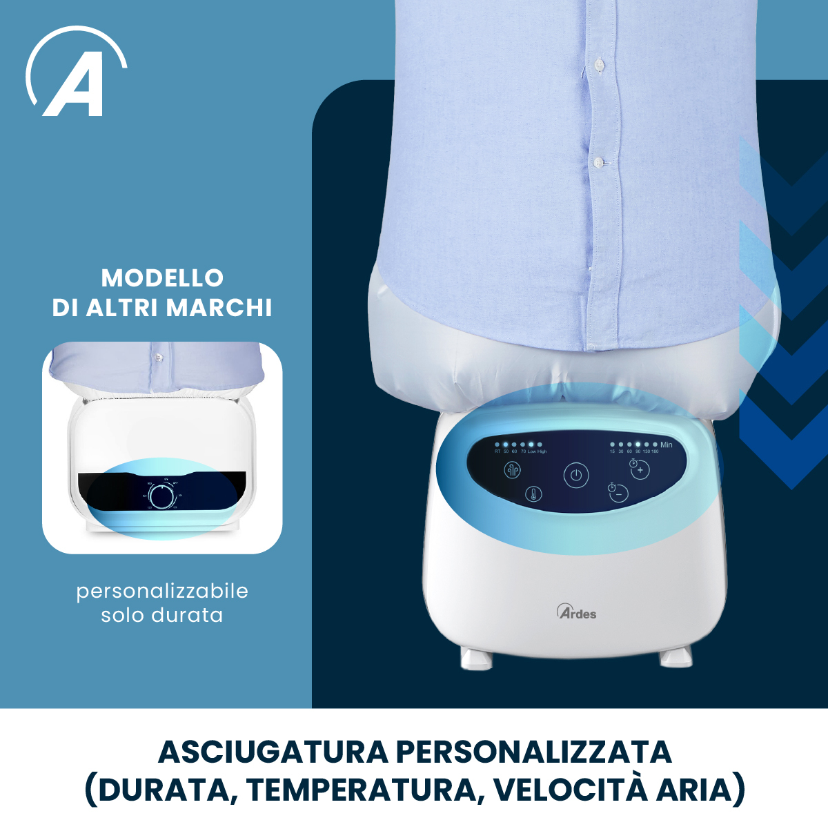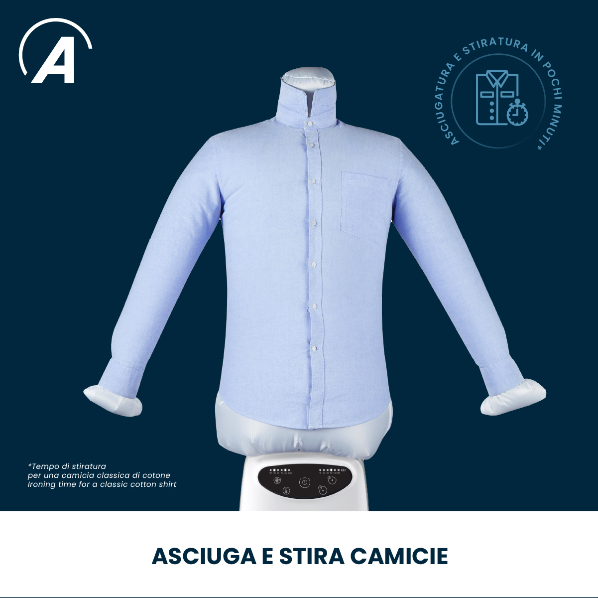 Tsunami asciuga e stira camicie automaticamente e in pochi minuti. Non solo camicie ma anche maglioni, t-shirt e abiti. Il manichino in innovativo tessuto traspirante permette un’asciugatura ultrarapida e una stiratura perfetta risparmiando tempo e fatica. In più grazie alle cerniere laterali si adatta facilmente a tutte le taglie.