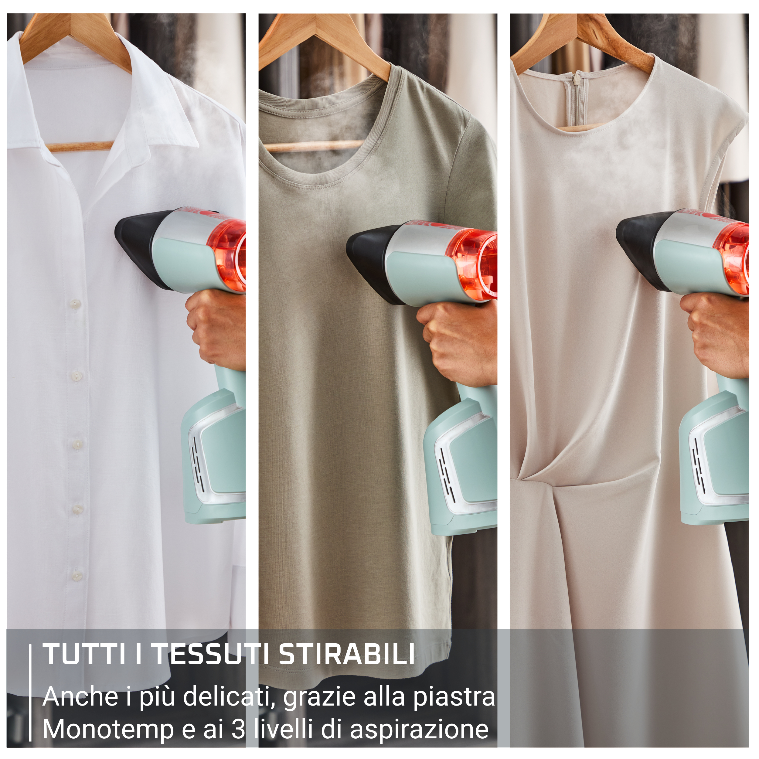 dei capi efficace, rapida e senza sforzi. Senza il bisogno di un asse da stiro o di un gancio per porta, AeroSteam