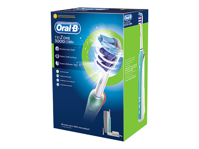 Oral-B TriZone 3000. Utilizzo: Adulto, Modalità dello spazzolino: Cura quotidiana, Sensibile, Lucidatura, Frequenza pulsazioni dello spazzolino: 40000 movimenti per minuto. Alimentazione: Batteria. Numero di spazzolini inclusi: 1 pz, Numero di testine incluse: 2 pz, Testine per spazzolino incluse: TriZone
