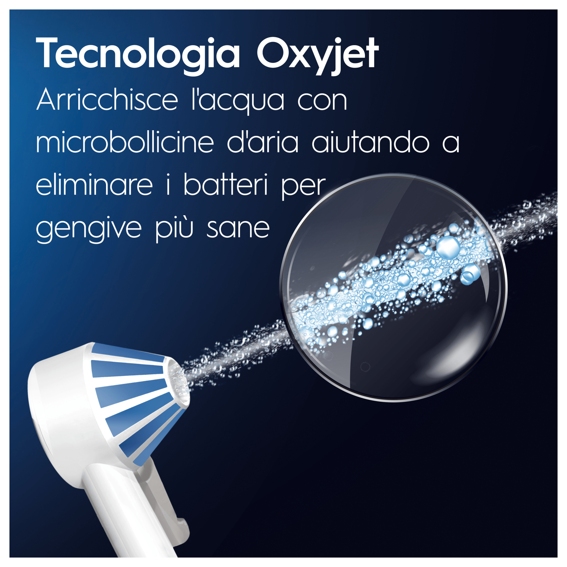 L’idropulsore Oral-B OxyJet utilizza una tecnologia con microbollicine che attacca i batteri che causano la placca.
