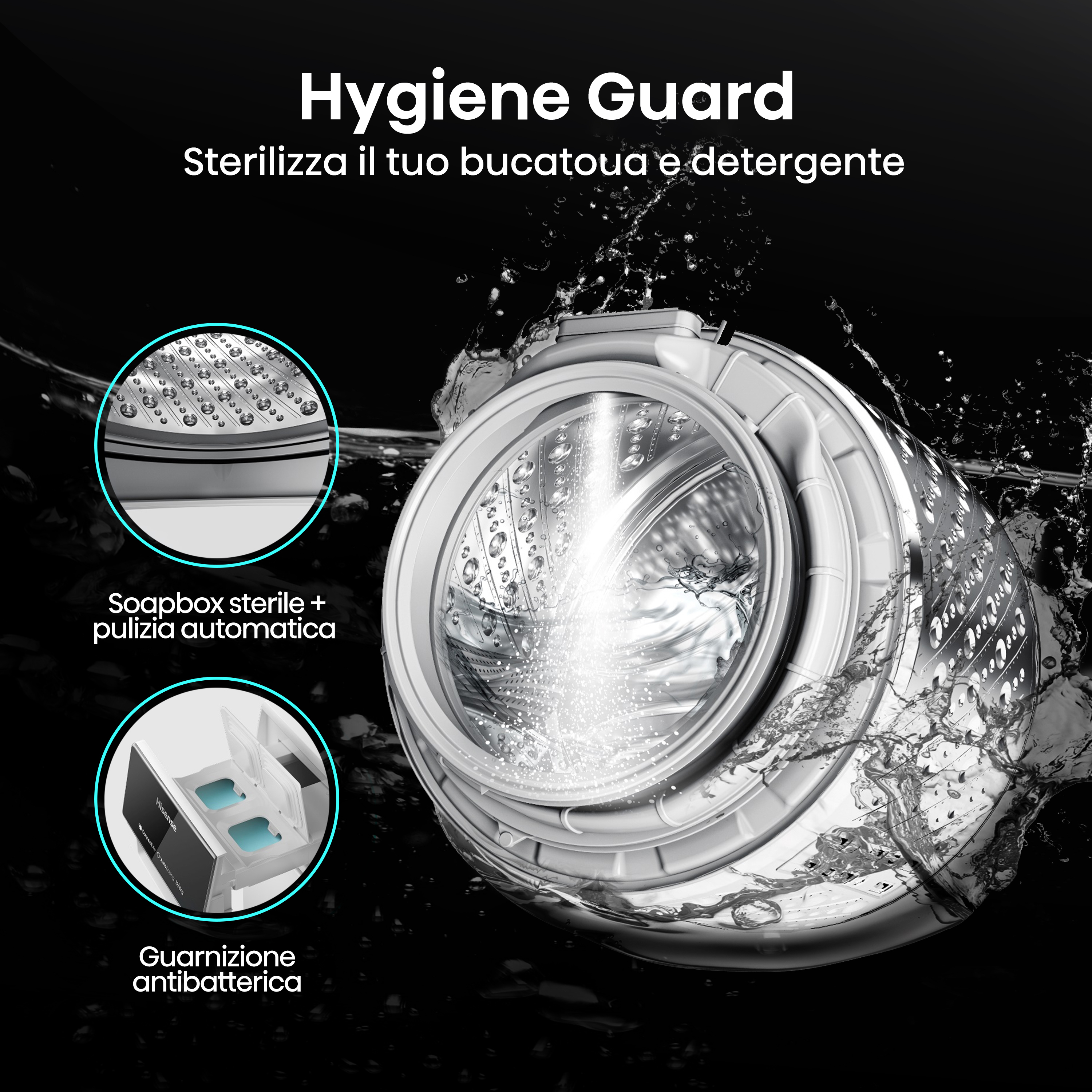 | Tecnologie Hisense (cura dei vestiti) | Allergy Care, Auto Dose, Big LED Display, Blocco bambini, App ConnectLife, Pulizia tamburo, Durable Inverter, Favourite, Half load, Hygiene Guard, Jet Wash, Pause & Add, Lavaggio rapido, Self-Diagnostic, Smart Assist, Smart Link, Vapore |