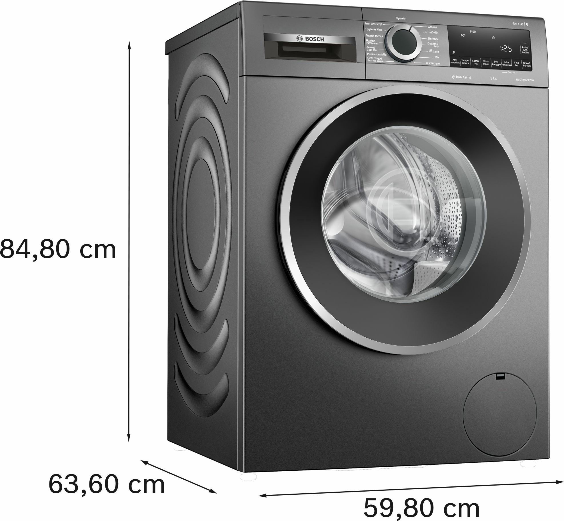Bosch Serie 6 WGG244ZRIT Lavatrice a carica frontale 9kg 1400g/min Antracite Classe A. Tipo di carica: Caricamento frontale. Capacità cestello: 9 kg, Classe di efficienza della centrifuga: B, Silenziosità (centrifuga): 70 dB, Velocità di centrifuga massima: 1351 Giri/min. Colore del prodotto: Grigio. Larghezza: 598 mm, Profondità: 590 mm, Altezza: 845 mm. Classe efficienza energetica: A