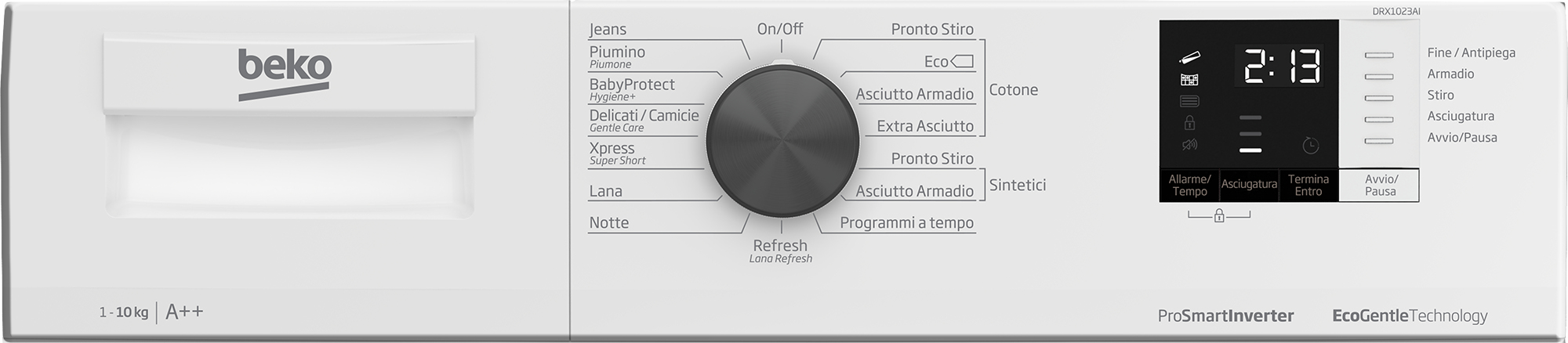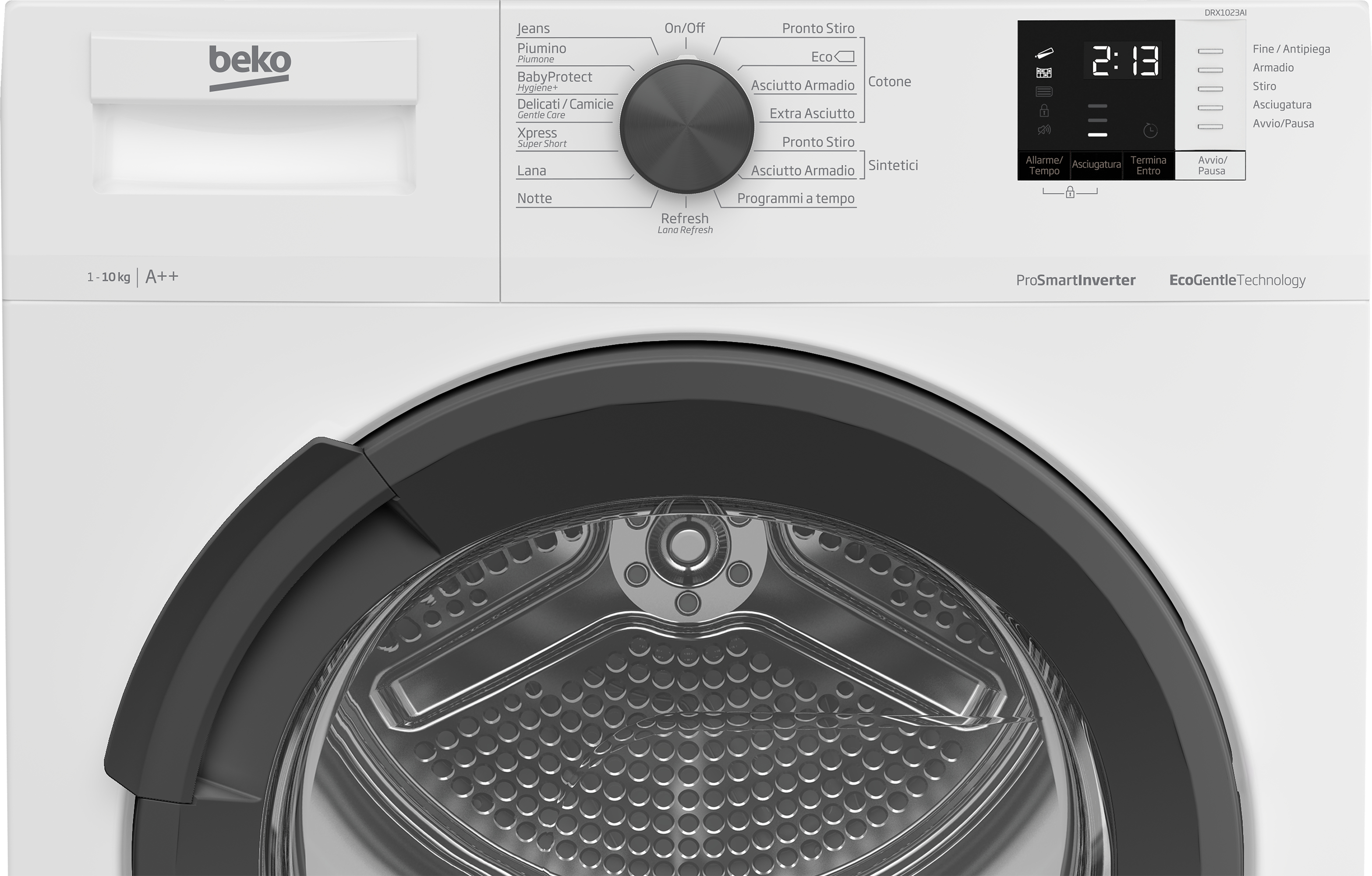 Beko DRX1023AI: Asciugatrice 10kg, Classe A++, Inverter. Posizionamento dell'apparecchio: Libera installazione, Tipo di carica: Caricamento frontale, Sistema di asciugatura: Pompa di calore. Capacità cestello: 10 kg, Classe di efficienza della condensazione: C, Programmi di asciugatura: Cura del bambino, Cotone, Delicati/Seta, Piumino/piumone, Eco, Jeans/denim, Mix, Sport, Sintetico. Partenza ritardata: 24 h. Classe efficienza energetica: E, Consumo energetico per 100 cicli: 150 kWh, Fonte di calore: Elettrico. Profondità: 540 mm, Larghezza: 597 mm, Altezza: 846 mm