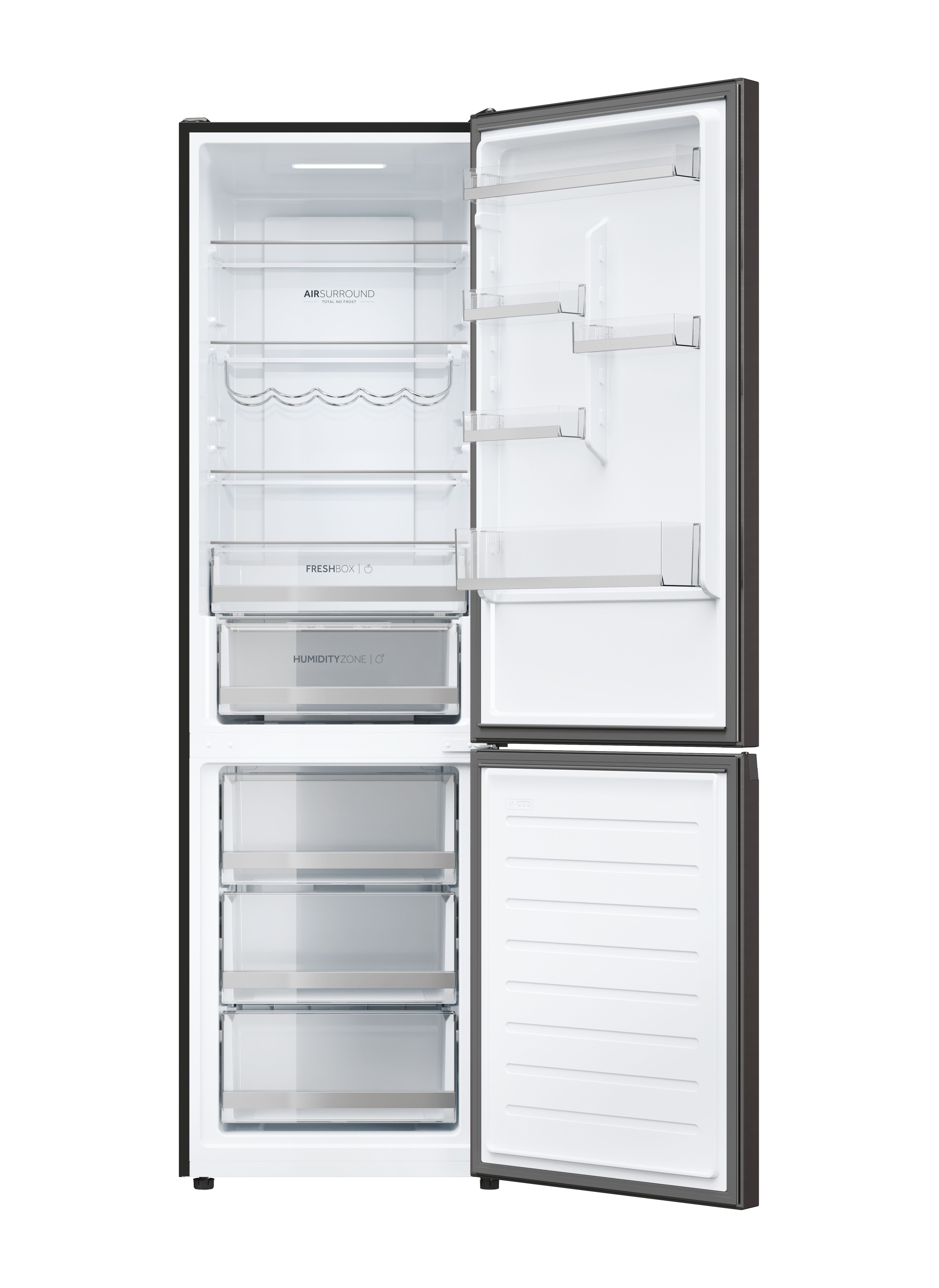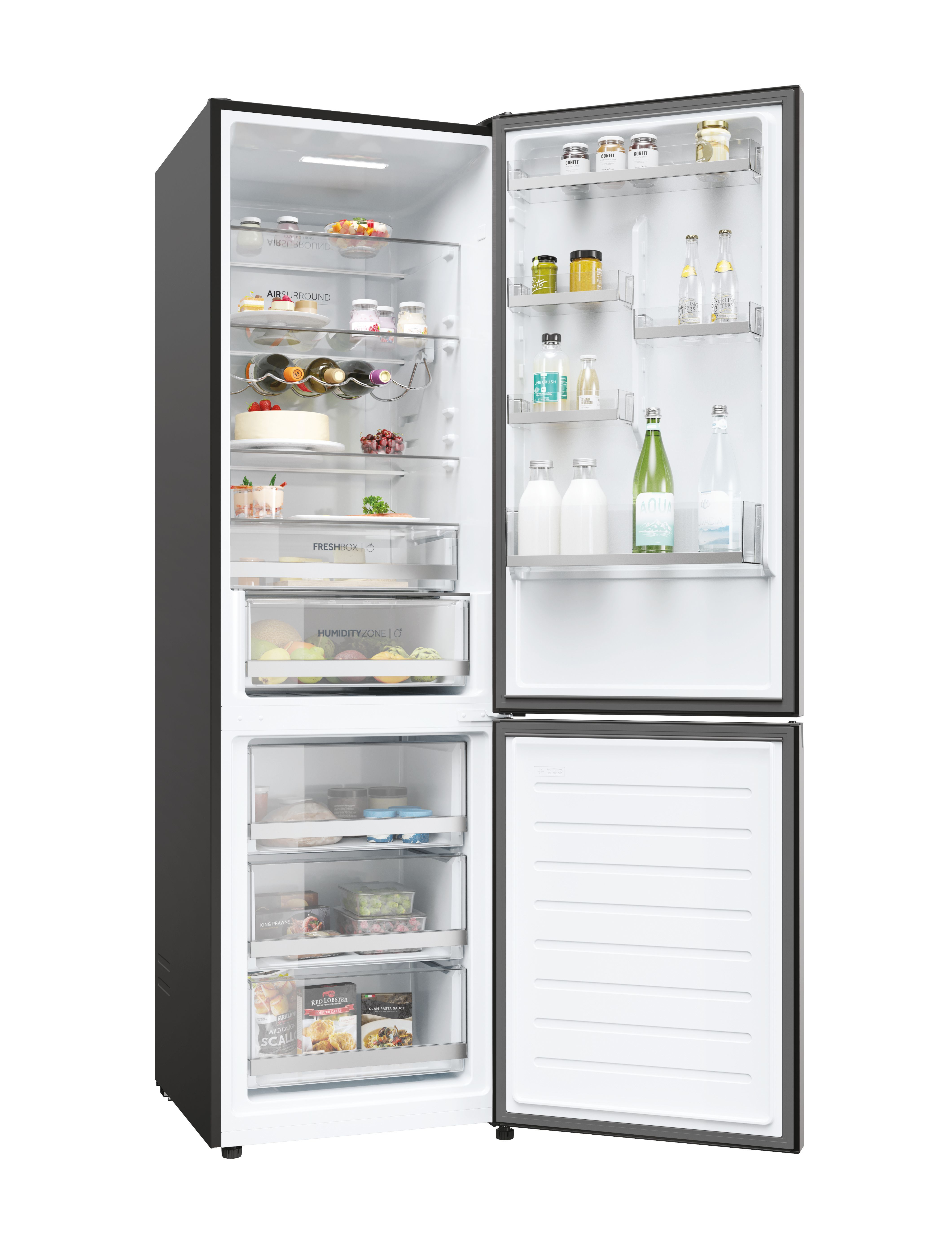 • Con Haier Air Surround Fresher Tech, l'aria scorre all’interno del frigorifero in modo più omogeneo così da mantenere il gusto, la consistenza e la succosità degli alimenti fino al 99%* dopo 7 giorni come il giorno 1. Infatti, grazie alle speciali uscite laterali sulla colonna, questo sistema distribuisce l'aria fredda uniformemente così da avvolgere gli alimenti in tutta la cavità del frigorifero ed evitando il flusso diretto sugli stessi, al fine di mantenerne la consistenza.