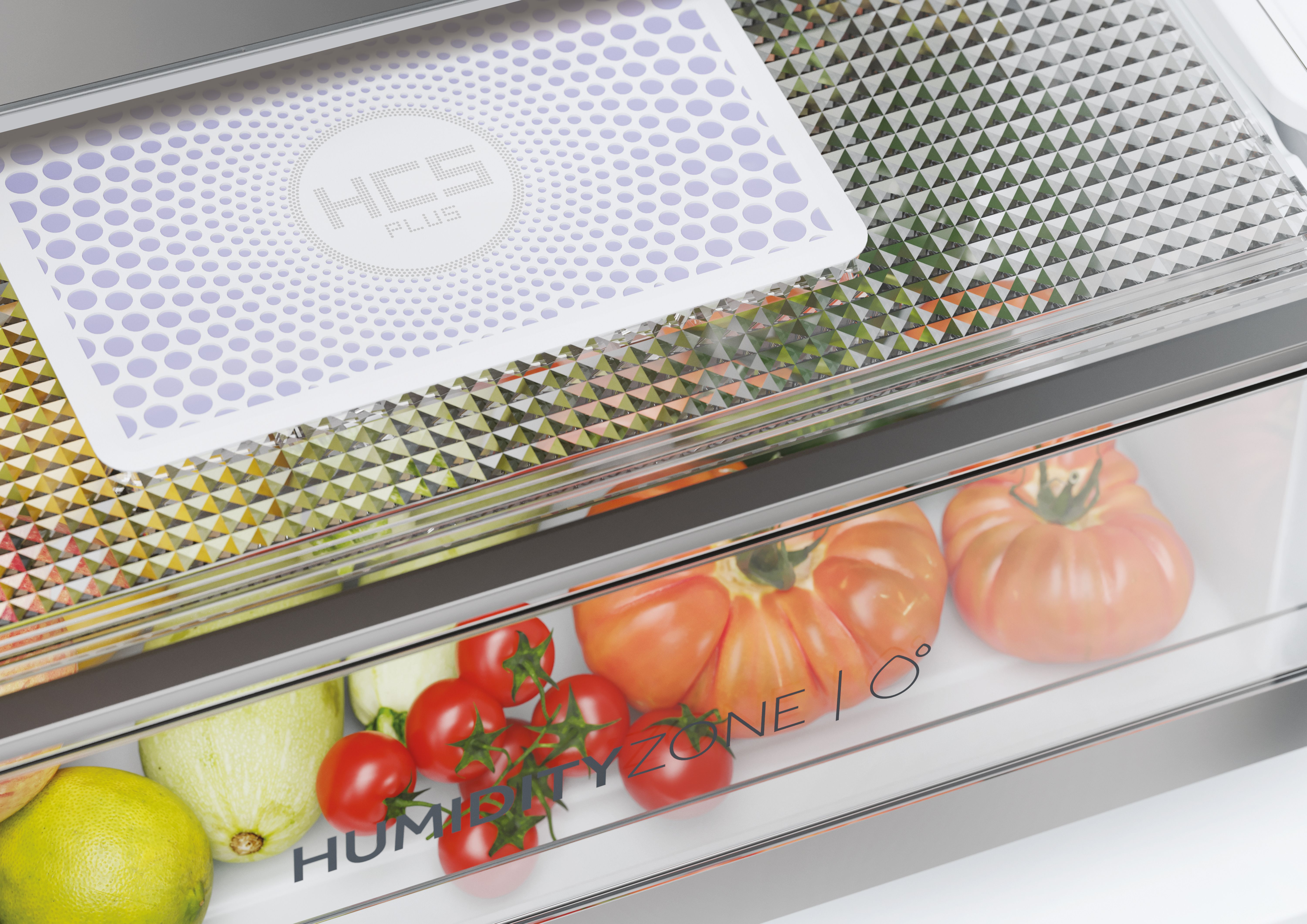 • La pratica Humidity Zone di Haier mantiene la tua frutta e verdura più fresca due volte più a lungo*. Ciò avviene grazie alla tecnologia HCS (Humidity Control System), una membrana in fibra vegetale in grado di mantenere l'umidità al 90% e di gestire automaticamente la giusta umidità. In questo modo si evita la formazione di condensa all'interno del cassetto. Mantenendo l'umidità all'interno dello scomparto al 90%, consente comunque la circolazione dell'aria fresca, così puoi conservare la spesa e mantenerne il contenuto nutrizionale più a lungo. *come certificato da VDE N. ID.40046454