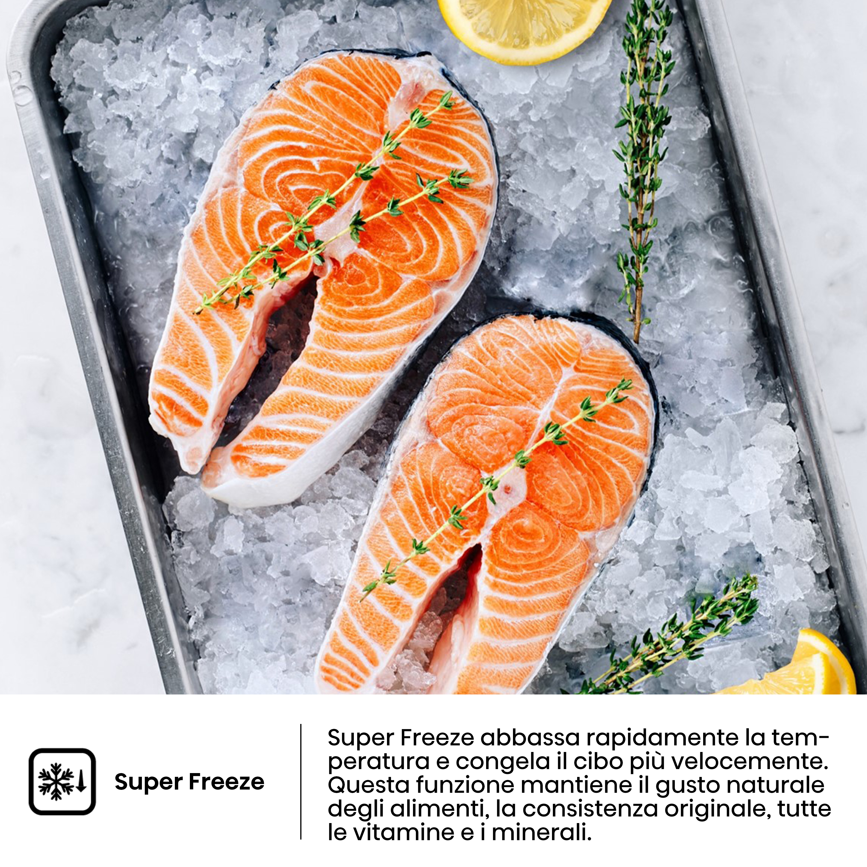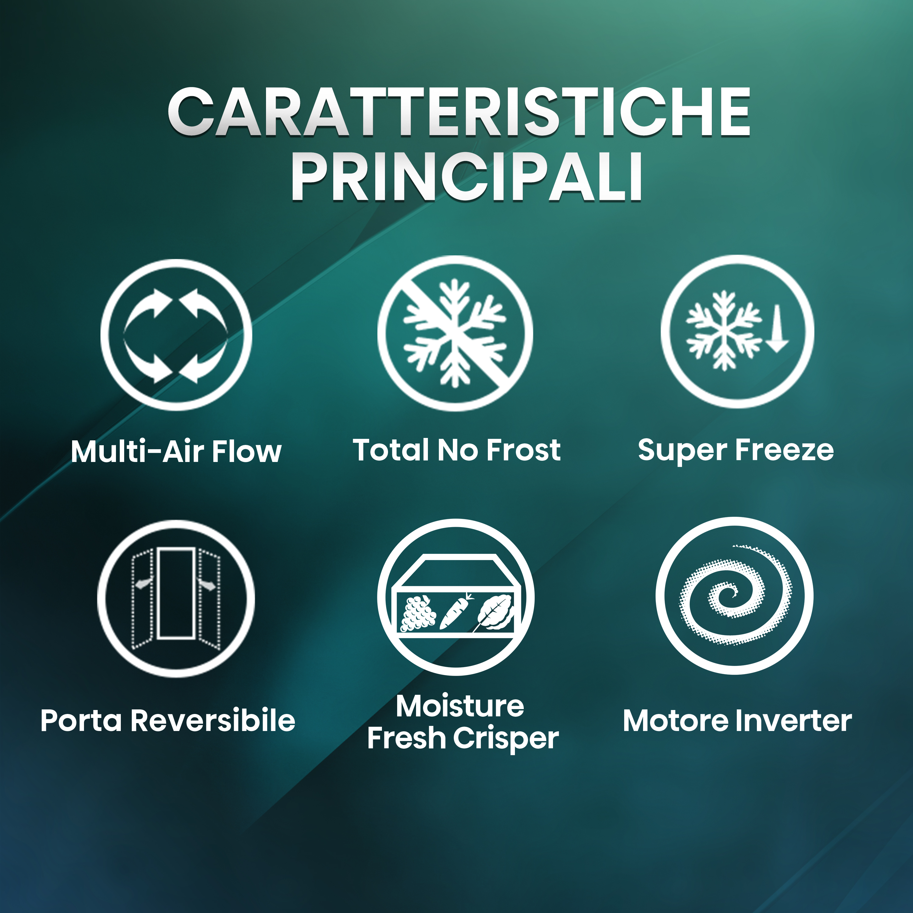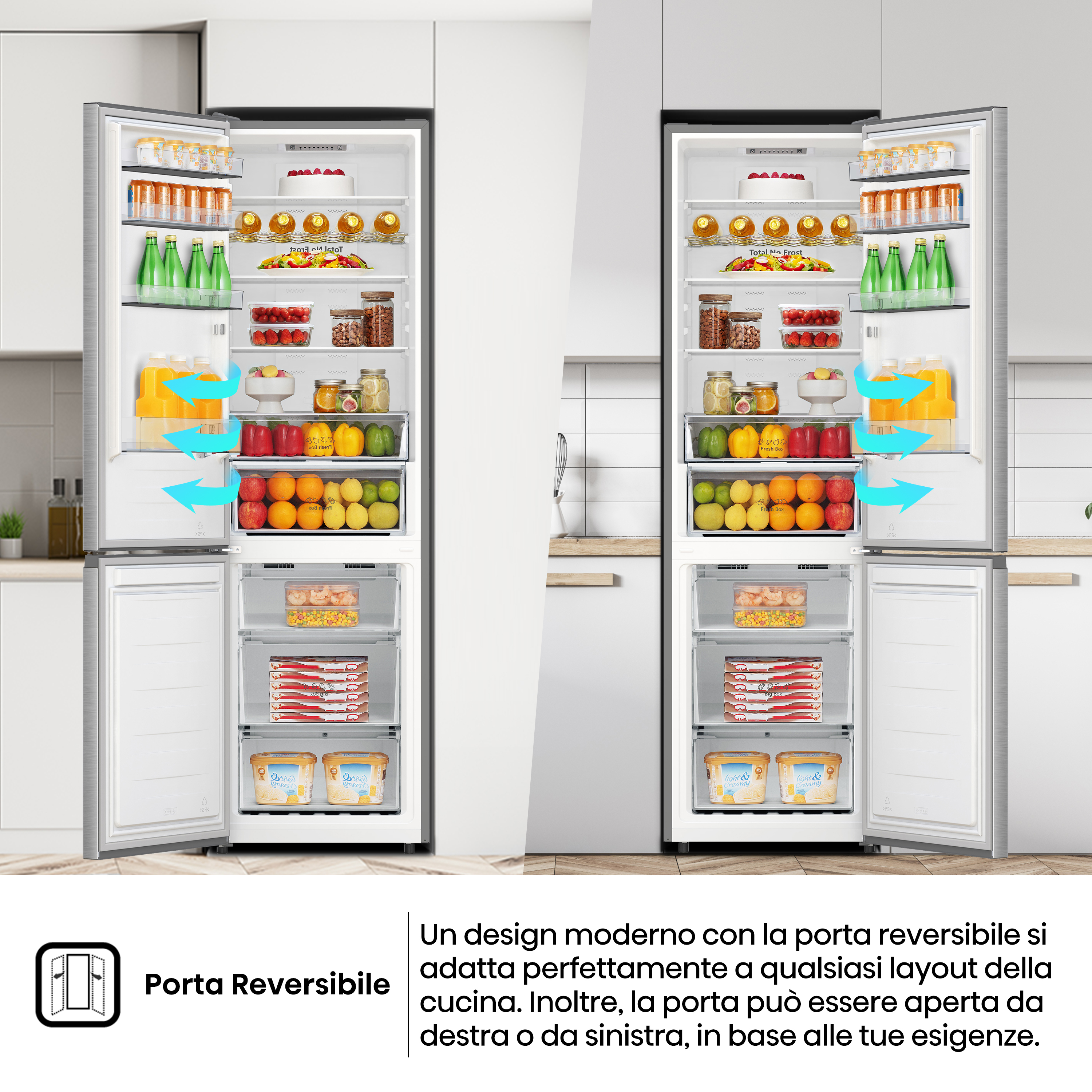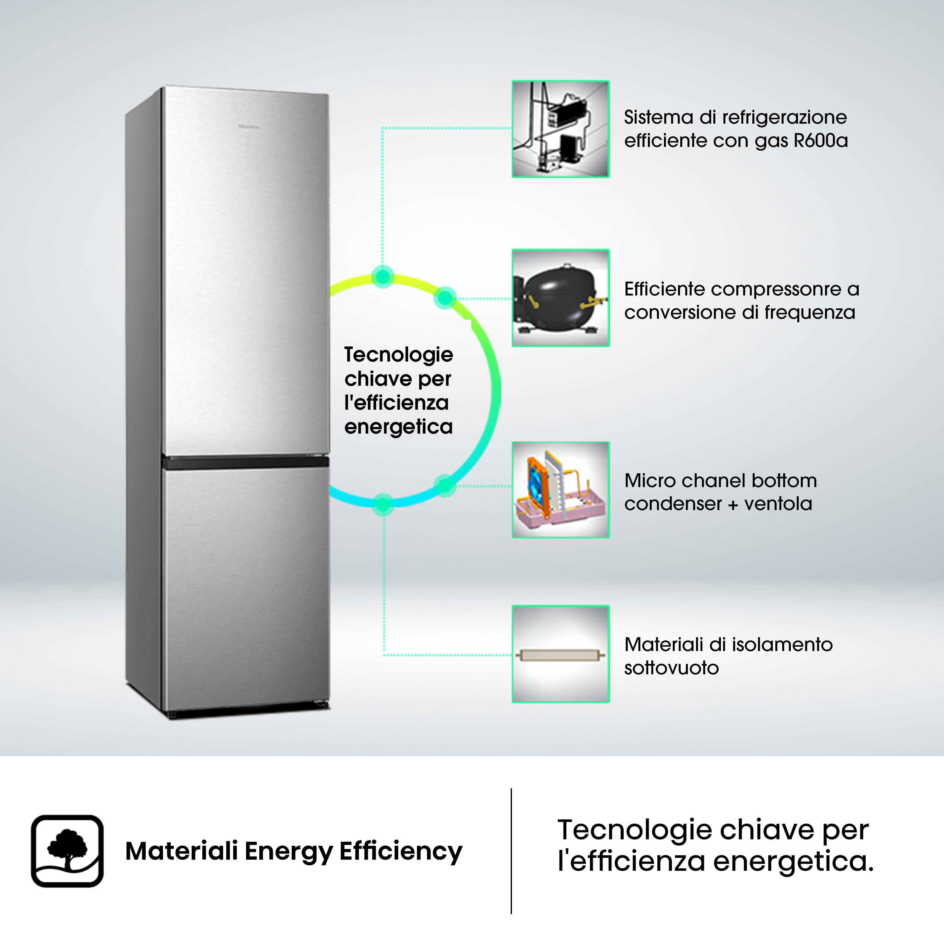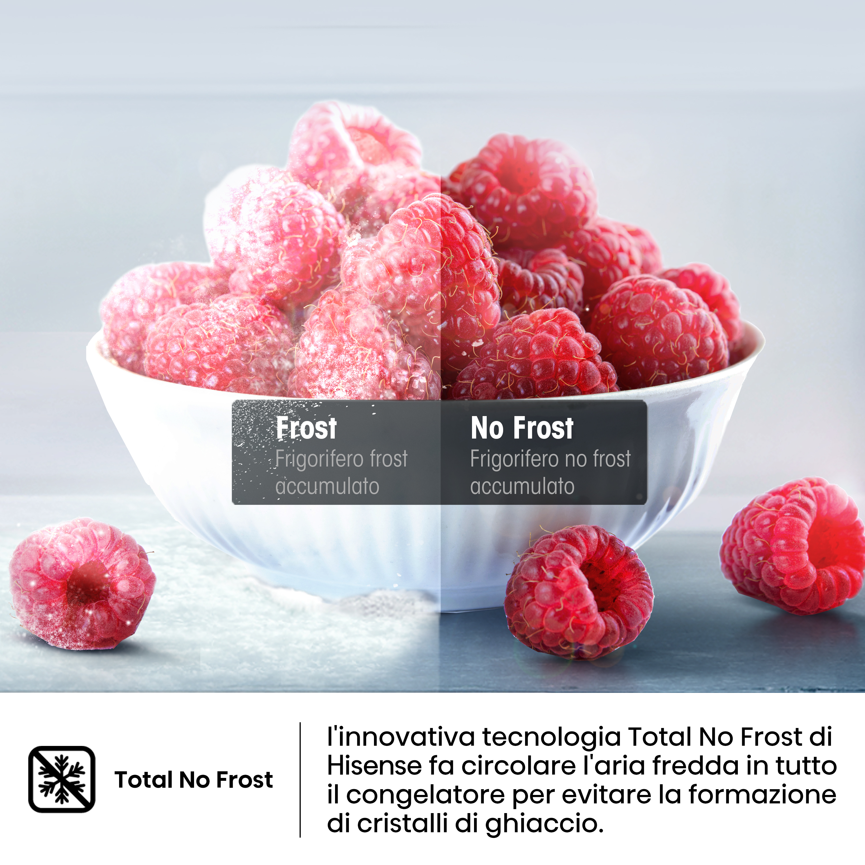 | Tecnologie Hisense (conservazione degli alimenti) | Metal-Tech Cooling, Micro Vent Cooling Technology, Reversible Door, Soft LED Lighting, Total No Frost, Wine Rack |