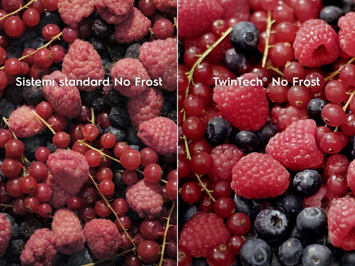 TwinTech Total No Frost è dotato di un avanzato sistema di raffreddamento doppio per il frigorifero e il congelatore. Questa tecnologia garantisce che il congelatore rimanga al riparo dal gelo e che l'umidità del frigorifero sia ottimale, evitando che gli alimenti si secchino.