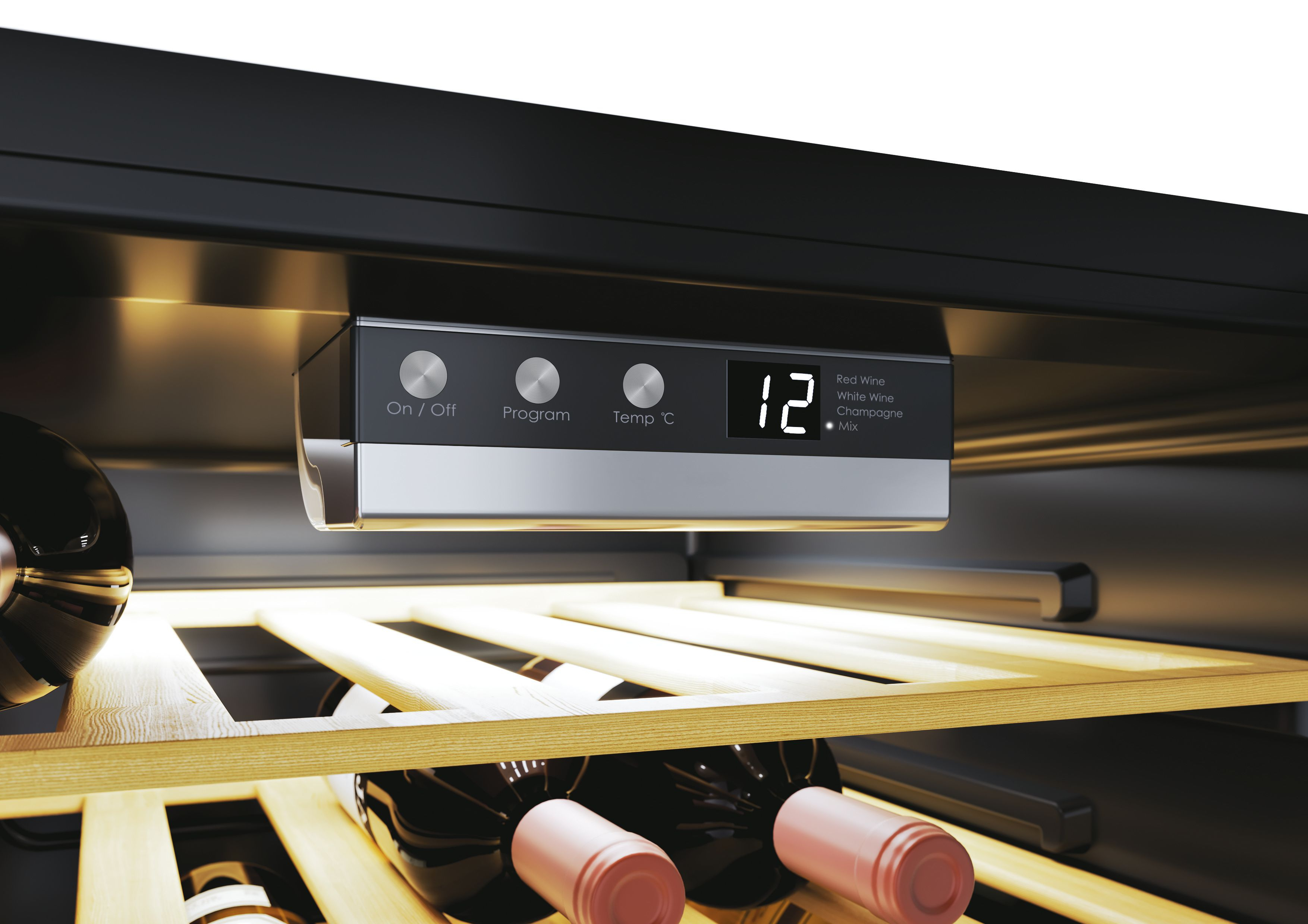 Il pannello di controllo elettronico ti permette di gestire in maniera semplice e intuitiva la tua cantinetta DiVino. Con pochi tocchi puoi accendere o spegnere la cantinetta per vino, selezionare specifici programmi con temperature dedicate per il bianco, il rosso, gli spumanti e i vini frizzanti o per conservare bottiglie miste. Se preferisci puoi anche impostare la temperatura che preferisci tra i 7 e i 18 gradi.