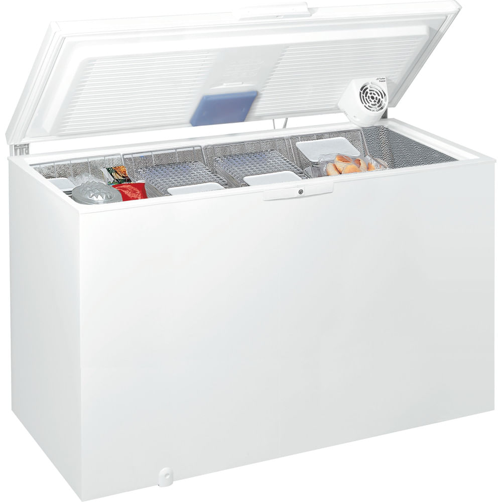 Whirlpool Congelatore a pozzetto - WHE39392 T. Capacità netta congelatore: 394 L, Classe climatica: SN-T, Capacità di congelamento: 19 kg/24h, Autonomia senza energia elettrica: 42 h, Emissione acustica: 42 dB, Punteggio: 4*. Cerniera porta: In alto. Tipo di lampada: LED. Classe efficienza energetica: E, Consumo energetico annuo: 262 kWh. Colore del prodotto: Bianco