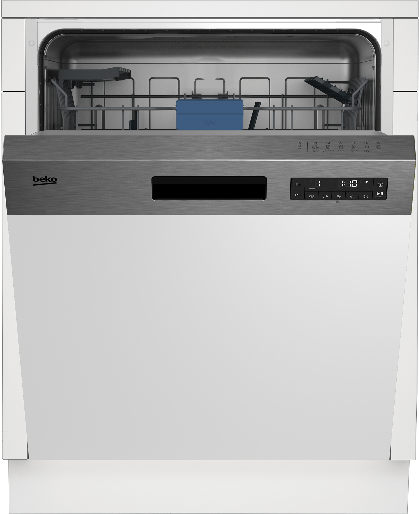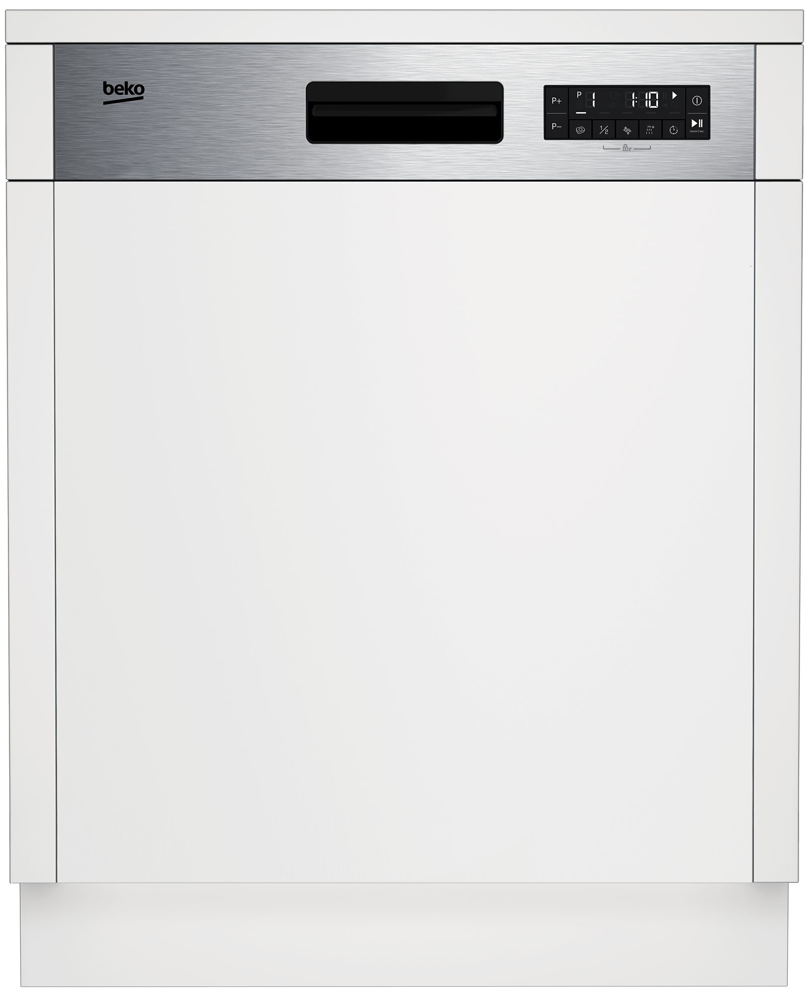 Beko b300 Lavastoviglie 60cm semi-integrata con cruscotto Inox, Classe D, 45 dBA. Posizionamento dell'apparecchio: A scomparsa parziale, Dimensione: Dimensione massima (60 cm), Colore pannello di controllo: Acciaio inox. Numero di coperti: 14 coperti, Classe emissione rumore: C, Emissione acustica: 45 dB. Classe efficienza energetica: D, Consumo di acqua per ciclo: 9,9 L, Consumo energetico per 100 cicli: 85 kWh. Larghezza: 598 mm, Profondità: 570 mm, Altezza: 818 mm. Larghezza imballo: 644 mm, Profondità imballo: 661 mm, Altezza imballo: 889 mm