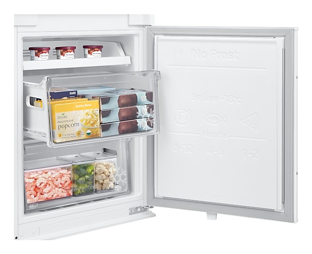 Samsung BRB80F26BCS0EF Frigorifero Combinato da Incasso F1rst 60 AI 1.78m 264L Total No Frost. Capacità netta totale: 264 L. Cerniera porta: Destra. Classe climatica: N-ST, Emissione acustica: 35 dB. Capacità netta frigorifero: 190 L, No Frost (frigorifero), Luce interna, Numero di ripiani frigorifero: 3. Capacità netta congelatore: 74 L, Capacità di congelamento: 6 kg/24h, No Frost (congelatore). Compartimento zona fresca. Classe efficienza energetica: C, Consumo energetico annuo: 148 kWh. Colore del prodotto: Bianco