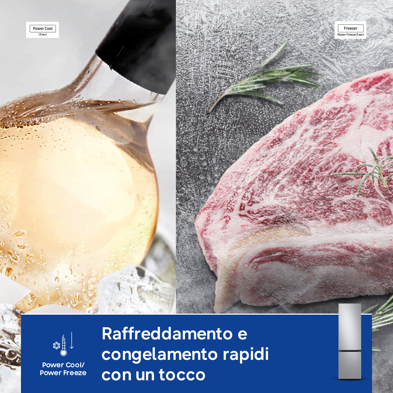 Anche la velocità è importante. Premendo un pulsante, la funzione Power Cool fa circolare un potente getto daria fredda nel frigorifero per raffreddare rapidamente cibi e bevande. La funzione Power Freeze fa la stessa cosa nel freezer. È il massimo per congelare o raffreddare i cibi al punto giusto, ma anche per preparare il ghiaccio.