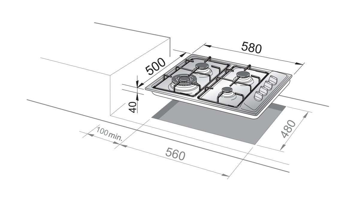 Piano ad incasso a gas da 60 cm con griglie in piattina smaltata e comandi laterali. Dal punto di vista delle misure, è il modello più utilizzato in cucina. Grazie a misure sobrie ed equilibrate, questo piano risulta essere la scelta ideale in tutti quei contesti in cui gli spazi ristretti obbligano a misure più contenute.