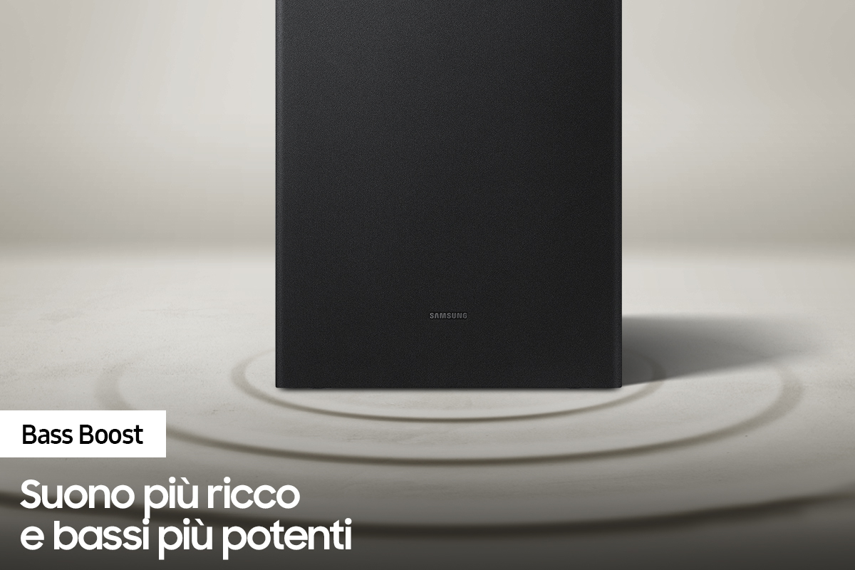 Immergiti in una dimensione sonora ancora più completa attivando la modalità Bass Boost sulla soundbar. Il subwoofer aumenta lintensità e la profondità dei bassi per unesperienza ancora più immersiva.