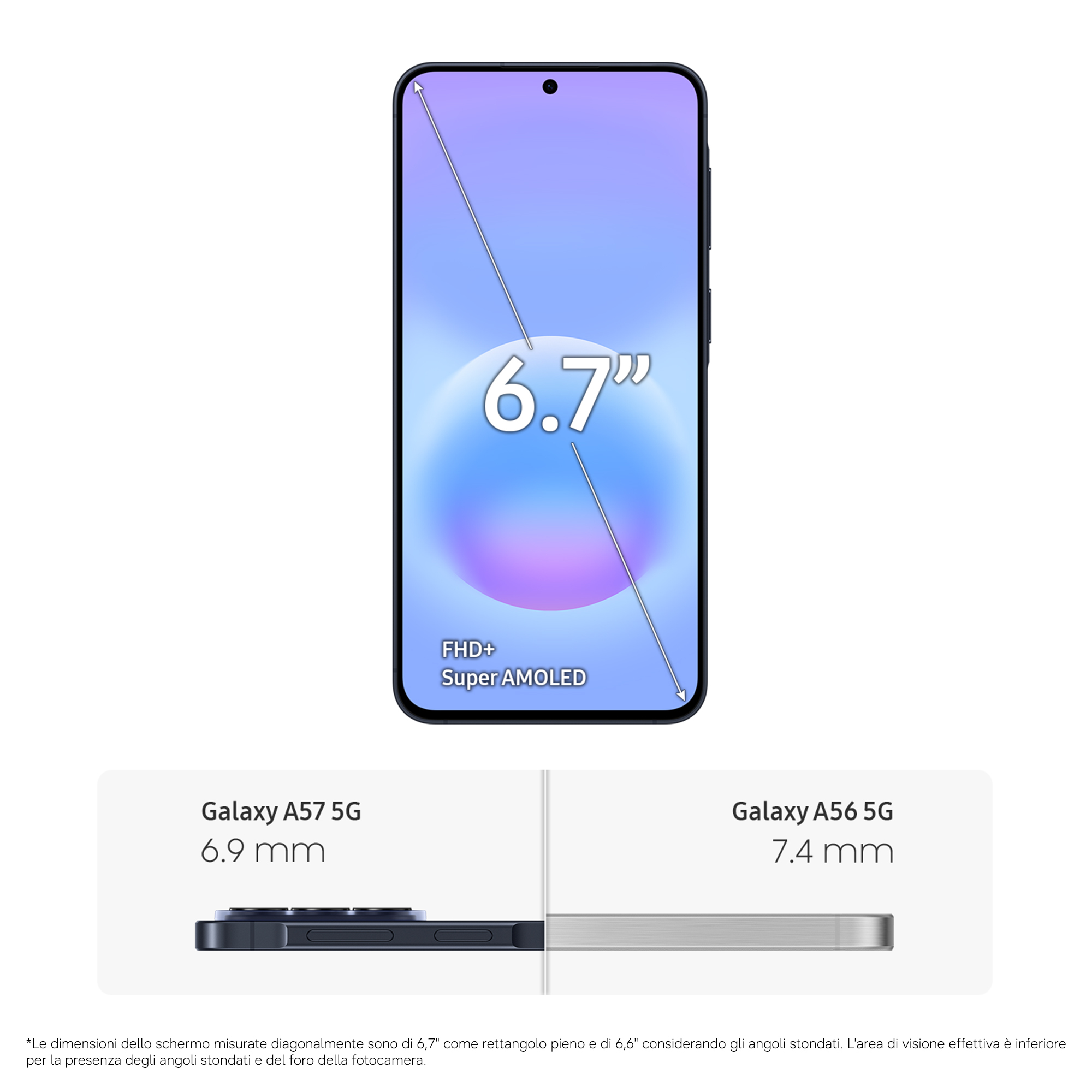 • Mantieni il tuo Galaxy A57 5G aggiornato e sicuro con un supporto software a lungo termine, che ti permette di goderti il tuo smartphone per anni. Galaxy A57 5G include 6 aggiornamenti del sistema operativo, per scoprire modi nuovi e più semplici per creare, connettersi e rimanere produttivi grazie ad azioni fluide e funzionalità di gestione del dispositivo. Non solo: le funzioni di sicurezza e manutenzione si aggiornano per 6 anni, per proteggerti dalle minacce di oggi e di domani.