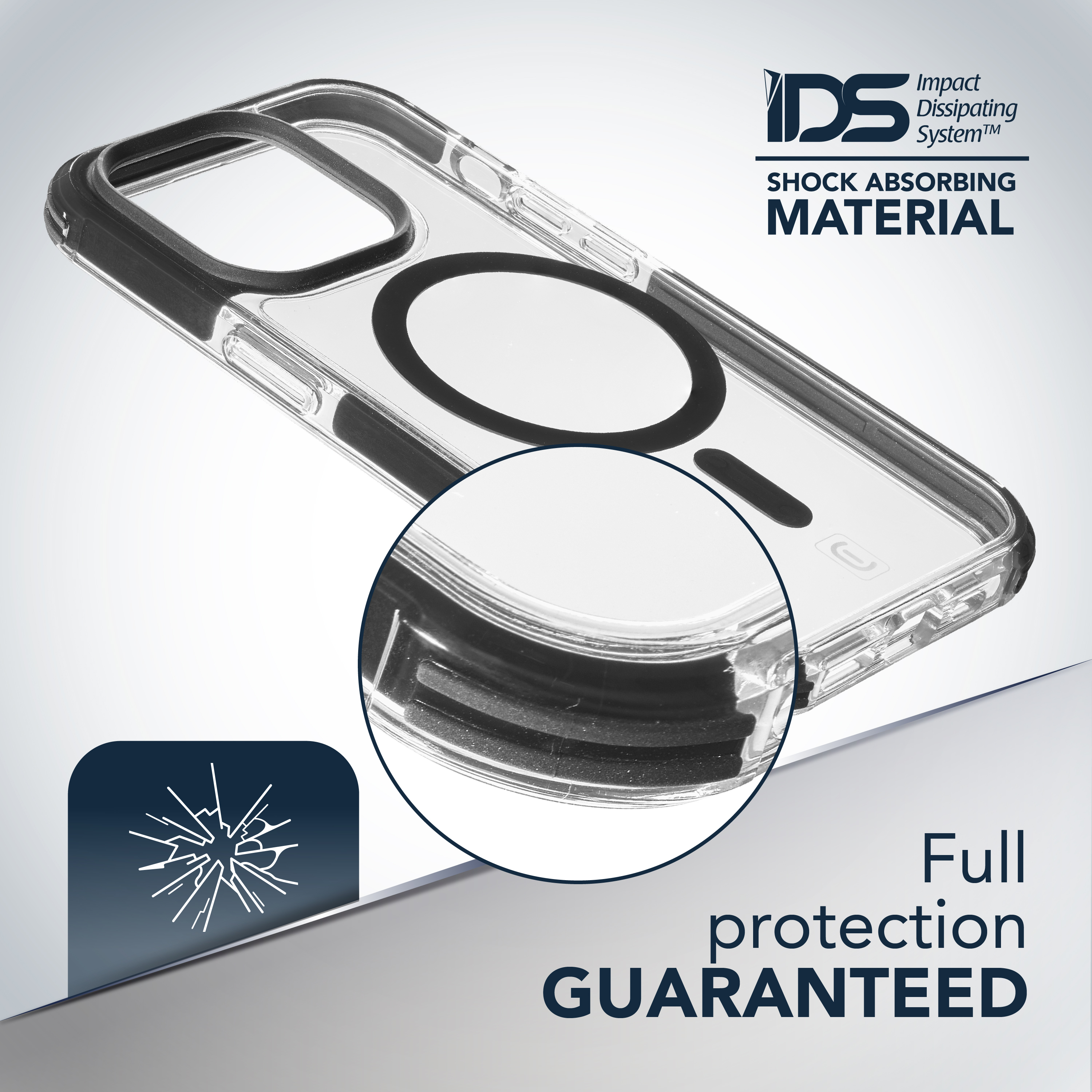 STRONG GUARD MAG è progettata per interagire con l’ecosistema Apple MagSafe. Grazie ai magneti integrati la custodia si allinea perfettamente al telefono e consente la ricarica e l’aggancio al caricabatterie MagSafe. È la custodia rigida ultra protettiva con bordo rialzato e angoli rinforzati, realizzata con materiali tecnologicamente avanzati in grado di attutire e dissipare l’urto causato da cadute. La tecnologia IDS (Impact Dissipating System)™, sviluppata da Cellularline, utilizza l’innovativo materiale Versaflex™ che consente di disperdere l’energia creata dall’urto, evitando possibili danni alle componenti esterne e interne dello smartphone. È realizzata con tecnologia antibatterica Microban® che elimina fino al 99,9% della crescita batterica sulla superficie della custodia e si mantiene costantemente attiva perché integrata nel materiale della Tetra Force Strong Guard.Tetra Force Strong Guard è garantita a vita: per saperne di più visita la sezione Guaranteed For Life di Cellularline