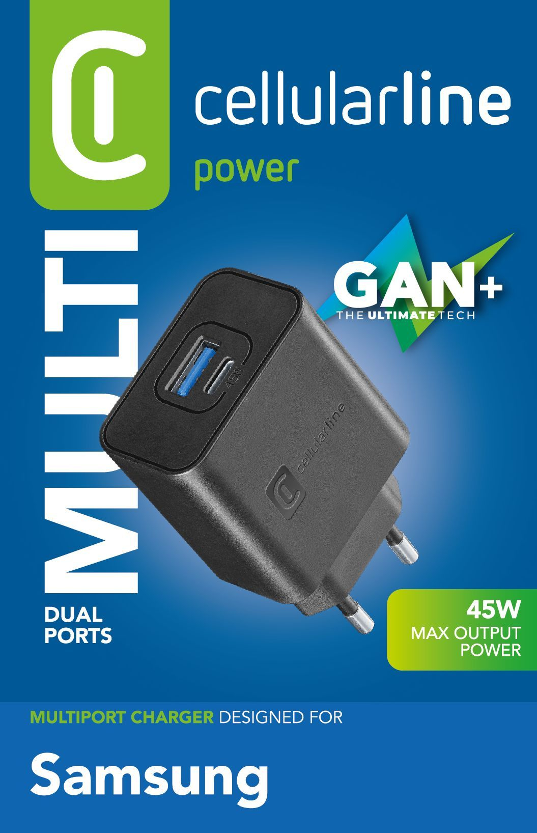Cellularline Dual Super Fast Charger 45W - Samsung Caricabatterie da rete 2 porte USB e USB-C con tecnologia Super Fast Charging 45W, Interno, AC, Nero