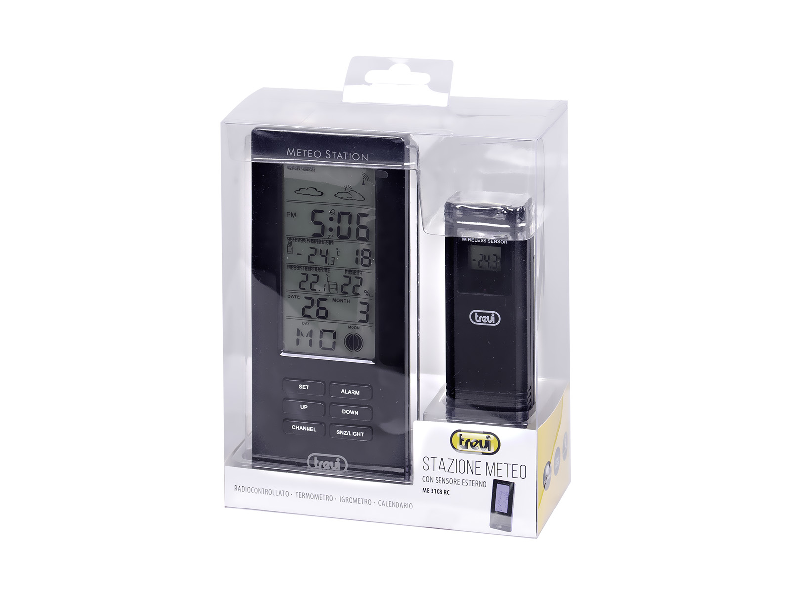 Stazione Meteo Trevi ME 3108 con Orologio radiocontrollato 12/24h, sveglia con suoneria programmabile e calendario con data e giorno della settimana multilingue.