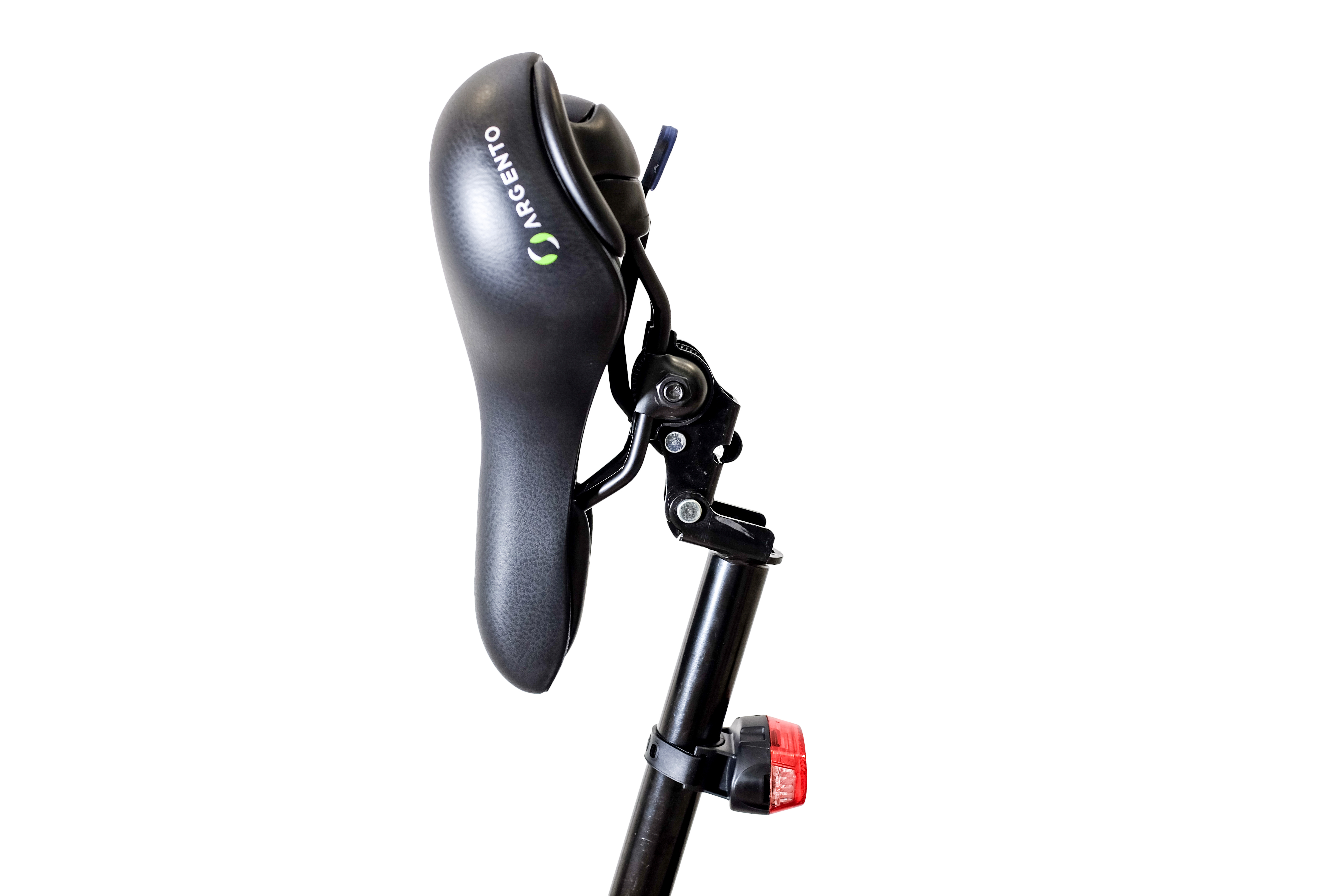 Comfort e design sono prerogative fondamentali in tutti i modelli Argento. Per questo la e-bike è dotata di leve freno con impugnatura ergonomica, cerchioni in alluminio abbinati al colore del telaio, manopole in eco-pelle, raggi completamente neri, sella in alluminio ribaltabile per permettere una facile e veloce rimozione della batteria (progetto made in Italy).