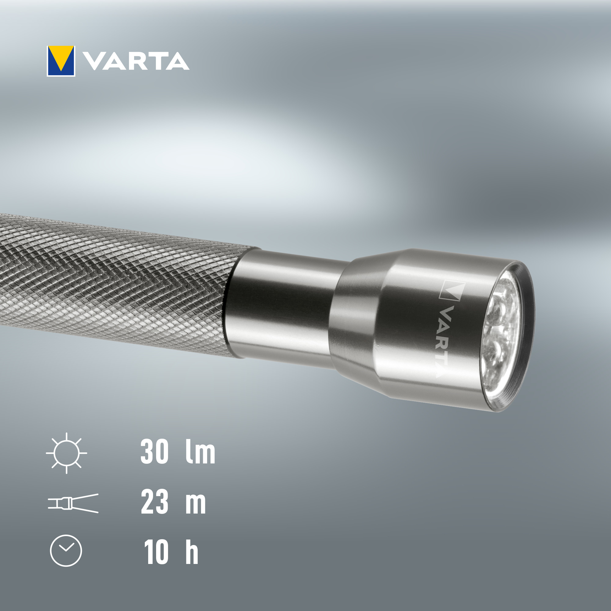 Varta Aluminium F10 LED Flashlight (incl. 2x Longlife Power AA Batterie per l'uso quotidiano, 150 lumen, antiurto, 3 anni di garanzia) argento per la casa, il campeggio, l'outdoor