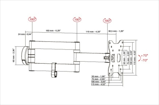 Munari SP367. Peso massimo (capacità): 15 kg, Capienza minima dimensioni dello schermo: 43,2 cm (17"), Capienza massima dimensioni dello schermo: 66 cm (26"), Compatibilità interfaccia di montaggio (min): 75 x 75 mm, Compatibilità interfaccia di montaggio (max): 100 x 100 mm. Inclinazione: -70 - 70°, Angolo di rotazione: 0 - 180°. Colore del prodotto: Nero