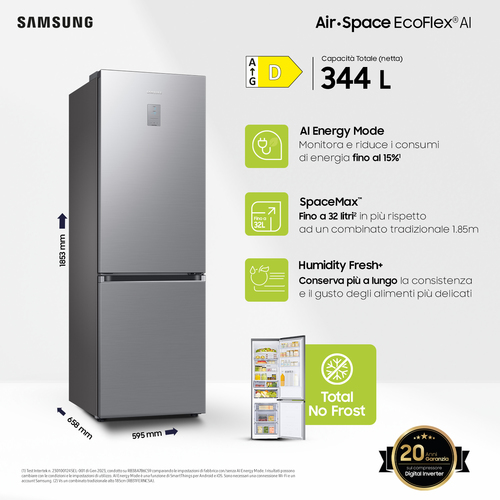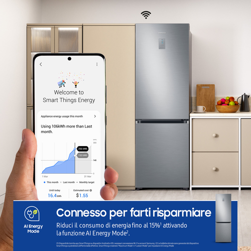 * Disponibile per specifici modelli da maggio 2023 con aggiornamento Wi-Fi. I risultati del test si basano sul confronto tra la temperatura come da impostazioni di fabbrica con modalità AI Energy e senza modalità AI Energy. I risultati possono variare a seconda delle condizioni e delle modalità di utilizzo.**Disponibile tramite la app SmartThings su dispositivi Android e iOS. Sono necessari una connessione Wi-Fi e un account Samsung.*** Le bollette stimate sono generate dal dispositivo SmartThings e potrebbero differire dalle bollette effettive. SmartThings mostrerà due opzioni: "Maximum Mode" e "Custom Mode" per impostare AI Energy Mode.