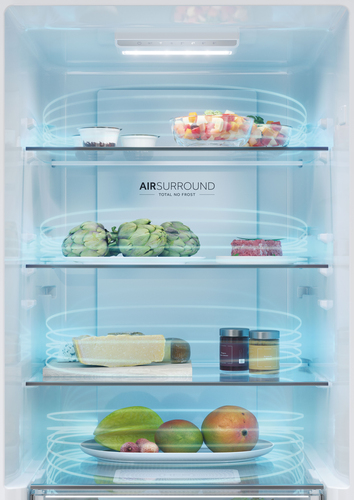 Con Haier Air Surround Fresher Tech, l'aria scorre all’interno del frigorifero in modo più omogeneo così da mantenere il gusto, la consistenza e la succosità degli alimenti fino al 99%* dopo 7 giorni come il giorno 1. Infatti, grazie alle speciali uscite laterali sulla colonna, questo sistema distribuisce l'aria fredda uniformemente così da avvolgere gli alimenti in tutta la cavità del frigorifero ed evitando il flusso diretto sugli stessi, al fine di mantenerne la consistenza. *Risultati dei test rilasciati da un laboratorio tecnico esterno indipendente confrontando un frigorifero con tecnologia Total No Frost Circle + con un frigorifero con tecnologia a flusso diretto.