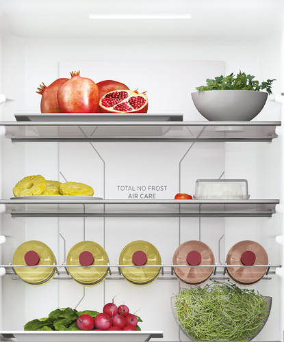 Il Total No Frost Air Care garantisce temperatura e umidità omogenee su ogni ripiano grazie ad un flusso d'aria delicato proveniente dalle uscite laterali della colonna all'interno del frigorifero Hoover e che non colpisce mai direttamente il cibo, permettendo di mantenerlo fresco come il primo giorno*.